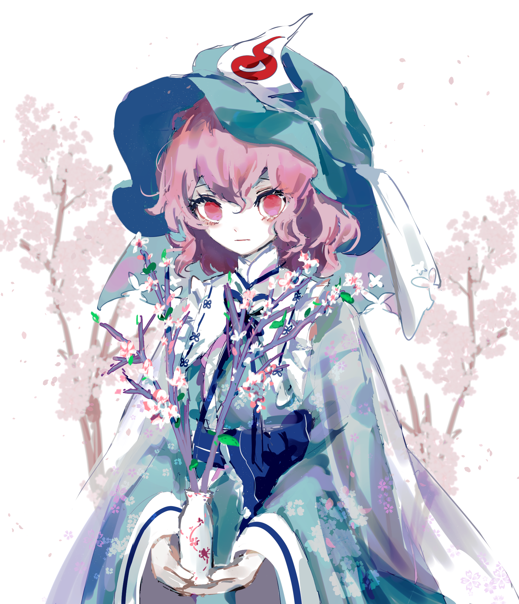 1girl blue_hat blue_kimono branch cake_mogo cherry_blossoms closed_mouth commentary commentary_request english_commentary expressionless eyebrows_hidden_by_hair hair_between_eyes hat highres holding_vase japanese_clothes kimono leaf long_sleeves looking_at_viewer medium_hair mob_cap obi own_hands_together pink_eyes pink_hair raised_eyebrows saigyouji_yuyuko sash solo touhou tree triangular_headpiece upper_body wide_sleeves