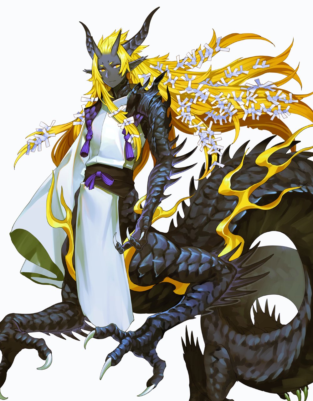 1boy black_skin blonde_hair bow claws colored_skin dragon dragon_boy dragon_horns eastern_dragon full_body hair_bow highres horns long_hair long_sleeves looking_at_viewer male_focus monster_boy multiple_horns original pointy_ears scales single_sleeve solo spines taur very_long_hair white_background wide_sleeves yellow_eyes yuzu_shio
