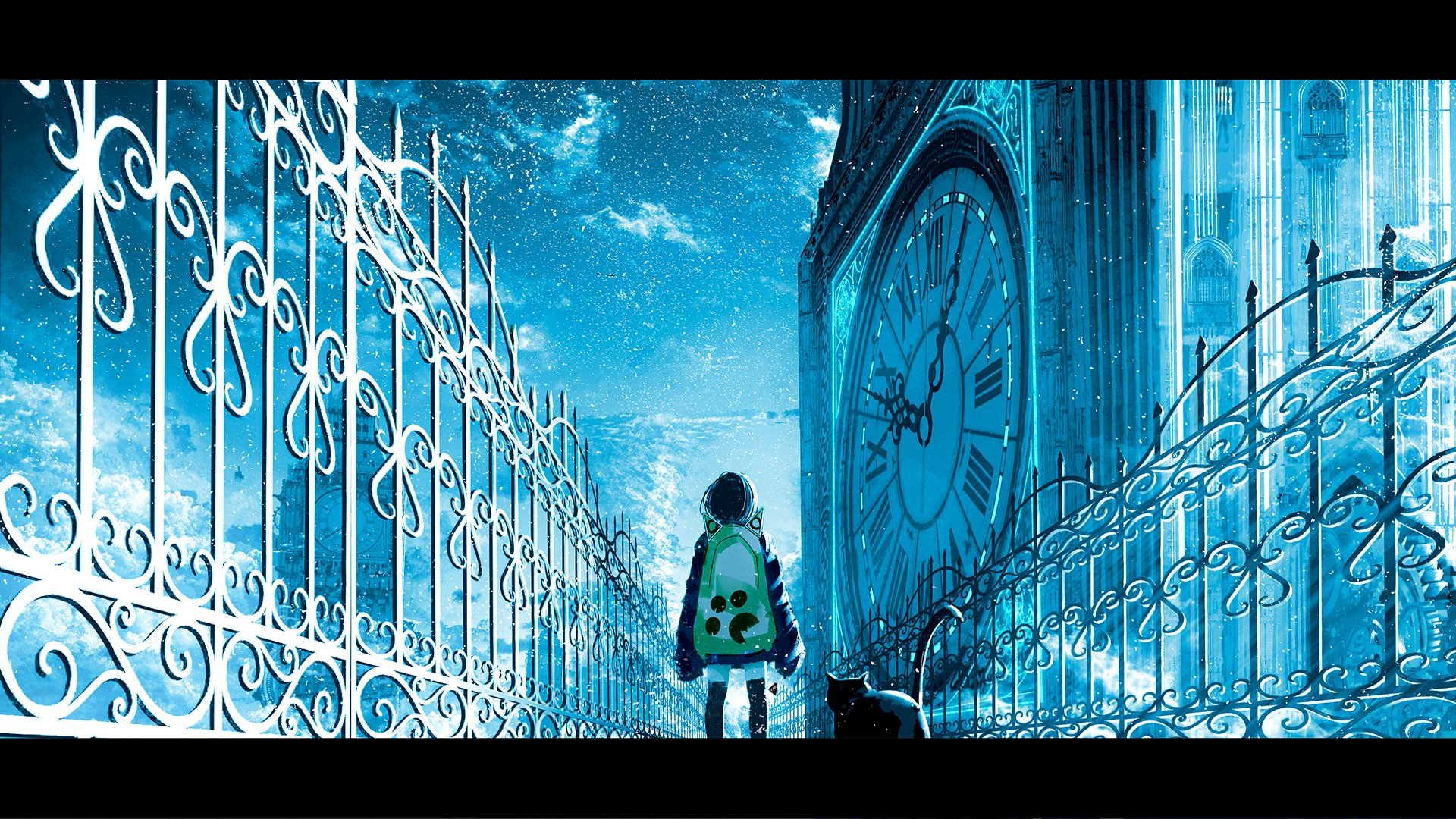 1girl animal_ears architecture arms_at_sides backpack bag black_background black_cat black_hair black_thighhighs blue_hoodie blue_sky blue_theme cat cat_ears cat_paw chooco_(chocoshi) clock clock_tower cloud elizabeth_tower facing_away fence framed from_behind giant gothic_architecture highres hood hoodie letterboxed light light_particles long_sleeves neon_trim original scenery shadow short_hair sky sleeves_past_wrists solo standing thighhighs tower walking wide_shot zettai_ryouiki