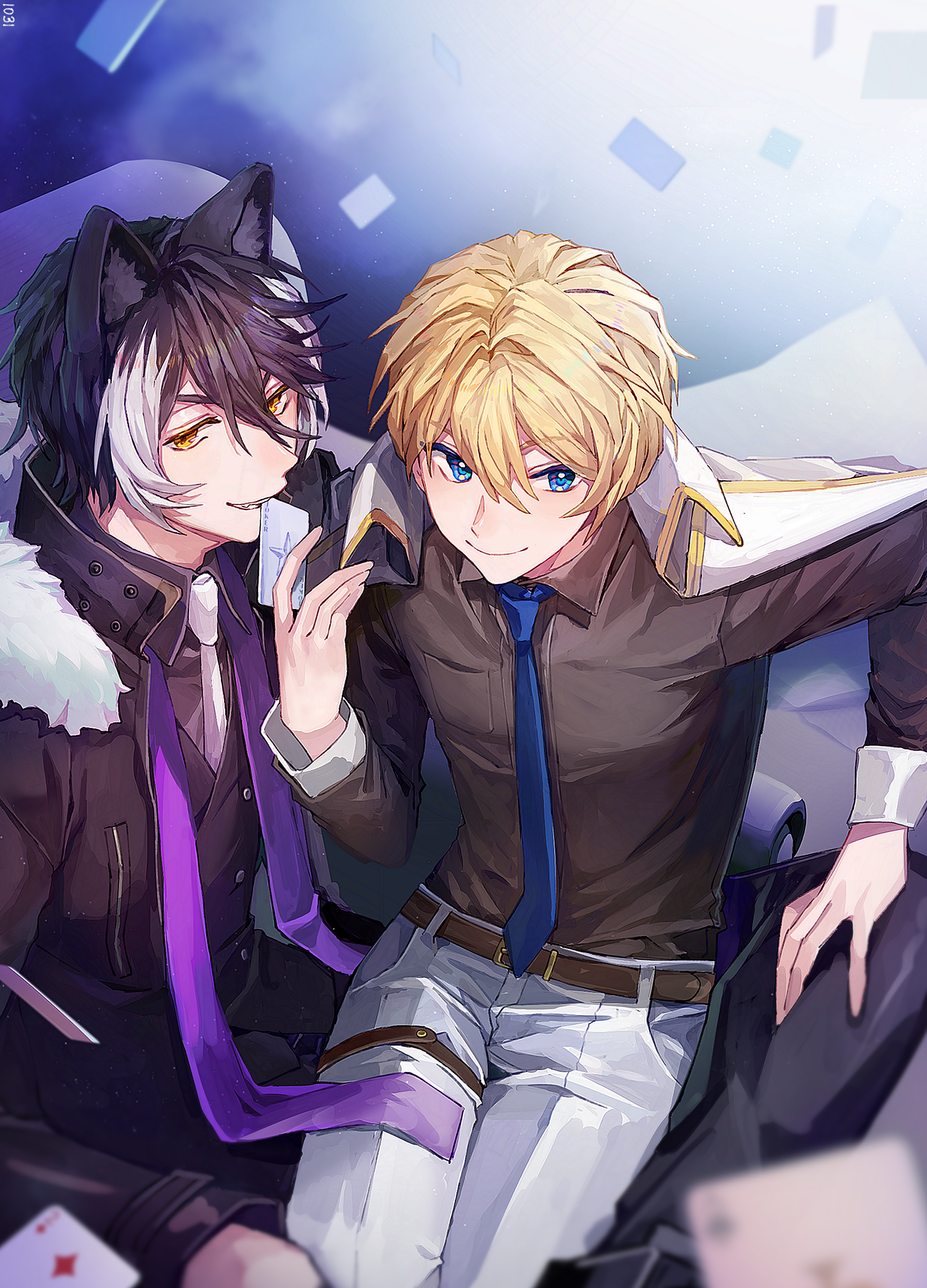>:) 2boys absurdres animal_ears arm_rest armchair belt black_hair black_jacket black_pants black_shirt black_vest blonde_hair blouse blue_eyes blue_necktie blurry brown_belt card card_background card_in_mouth chair collared_shirt cowboy_shot creepyday crossed_legs depth_of_field floating_card fur-trimmed_jacket fur_trim gradient_background grin hair_between_eyes hand_on_another's_calf highres holding holding_card holostars jackal_boy jackal_ears jacket jacket_on_shoulders joker_(playing_card) kageyama_shien kishido_temma kishido_temma_(1st_costume) looking_at_viewer male_focus mouth_hold multicolored_hair multiple_boys necktie pants playing_card shirt short_hair sitting sitting_on_lap sitting_on_person smile star_(symbol) stole teeth_hold thigh_strap two-tone_hair v-shaped_eyebrows vest virtual_youtuber white_hair white_jacket white_necktie white_pants yellow_eyes