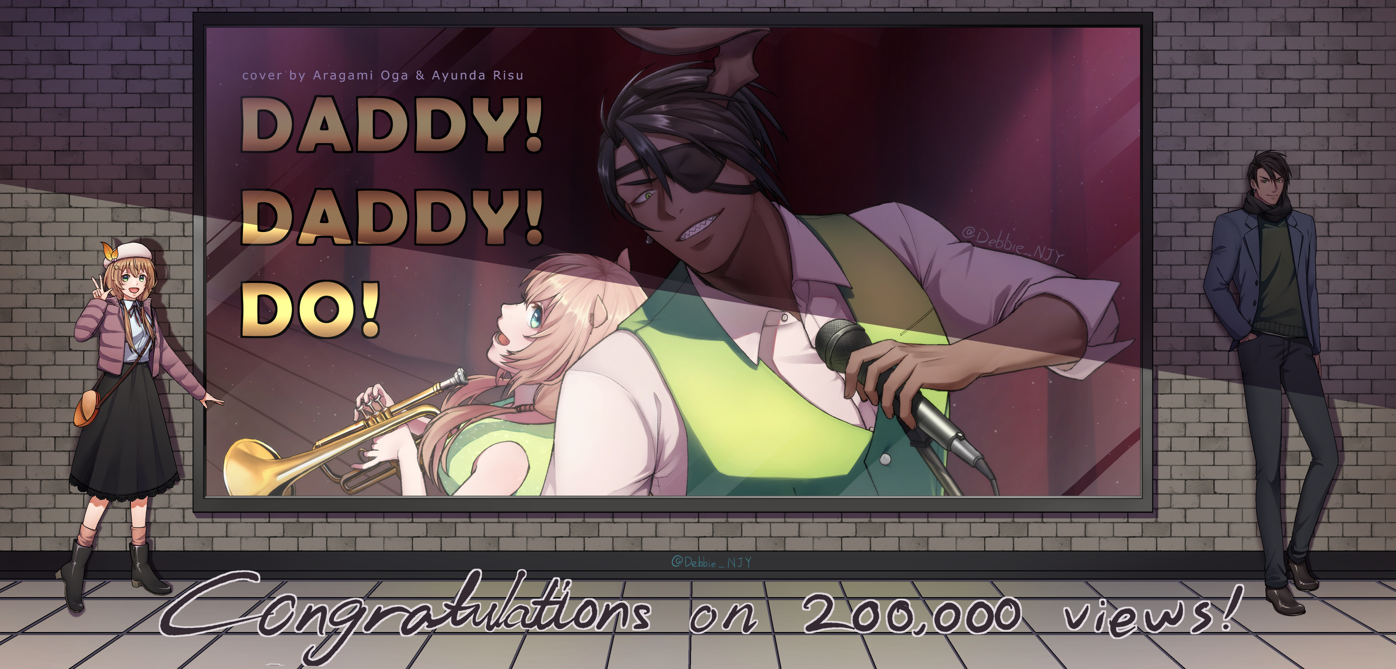 1boy 1girl :d absurdres against_wall alternate_costume animal_ears aragami_oga ayunda_risu back-to-back bag beret billboard black_footwear black_hair black_pants black_scarf black_skirt blouse blue_jacket boots brick_wall brown_hair character_name chestnut_bag collared_shirt curtains dark-skinned_male dark_skin debbie_njy dress earrings english_text eyepatch full_body green_dress green_eyes green_sweater_vest green_vest grin hair_ornament hand_in_pocket hat hat_ornament highres holding holding_instrument holding_microphone hololive hololive_indonesia holostars horns instrument jacket jewelry leaf_hair_ornament leaf_hat_ornament long_hair looking_at_viewer loose_socks low_twintails microphone milestone_celebration neck_ribbon no_horns open_mouth padded_jacket pants pink_legwear purple_jacket red_ribbon ribbon scarf sharp_teeth shirt short_hair shoulder_bag single_earring single_horn skirt sleeveless sleeveless_dress sleeves_rolled_up smile socks song_name squirrel_ears squirrel_girl stage standing sweater_vest teeth trumpet twintails upper_body vest virtual_youtuber w white_headwear white_shirt