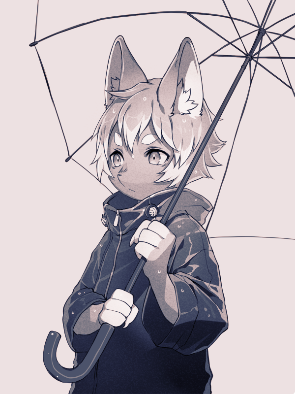 1boy :/ animal_ear_fluff animal_ears body_fur child colored_tips fingernails fox_boy furry furry_male grey_background greyscale holding holding_umbrella looking_away male_focus monochrome multicolored_hair original raincoat sharp_fingernails short_eyebrows short_hair solo thick_eyebrows umbrella upper_body water_drop wet yuzu_shio