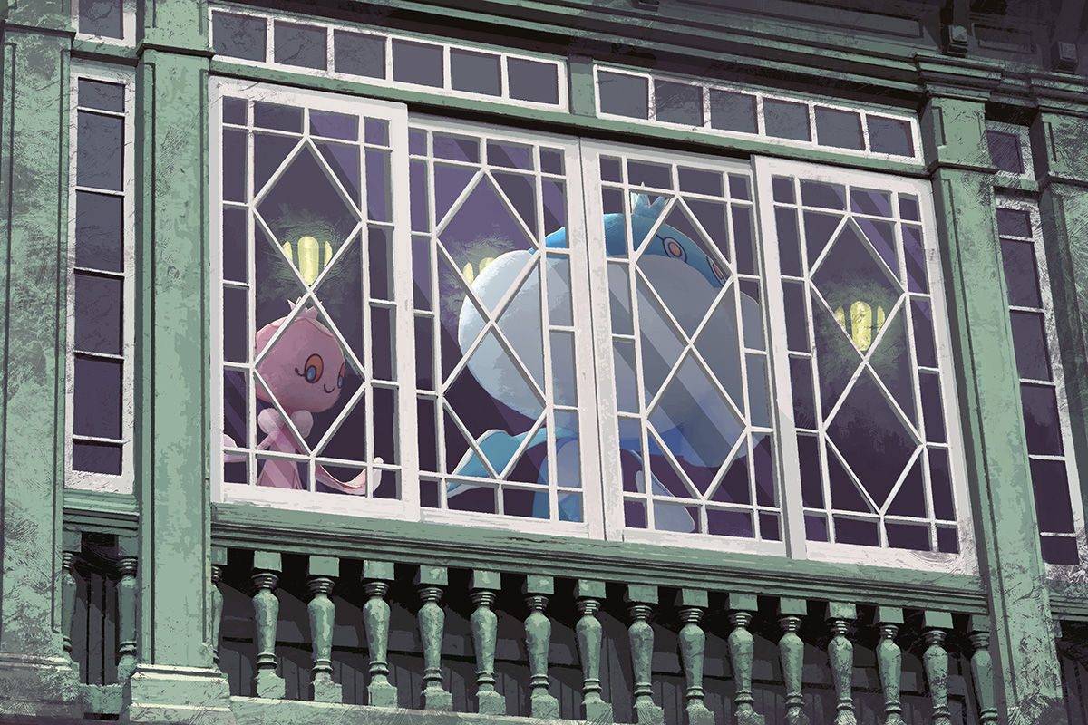 closed_mouth commentary_request frillish frillish_(female) gen_5_pokemon glass jellicent jellicent_(male) light looking_down looking_outside nintendo no_humans pink_eyes pokemon pokemon_(creature) smile toy(e) window
