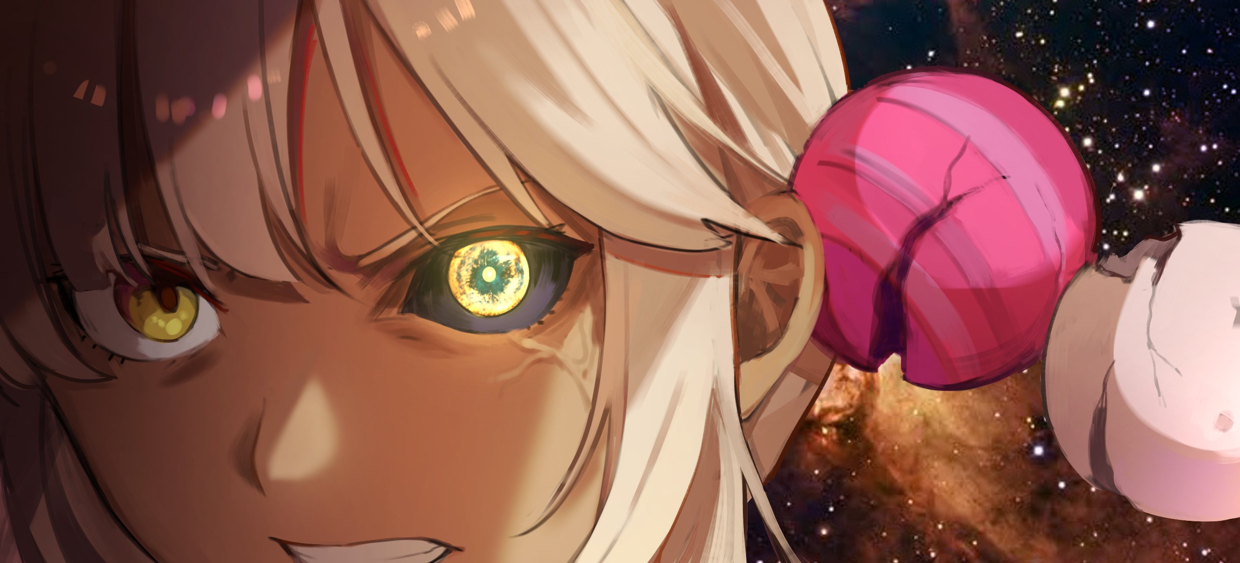 1girl angry black_sclera clenched_teeth colored_sclera hair_ornament highres hololive hololive_english light_brown_hair looking_at_viewer mismatched_sclera planet_hair_ornament portrait rakku_(rkrmz0n) solo teeth tsukumo_sana v-shaped_eyebrows virtual_youtuber yellow_eyes