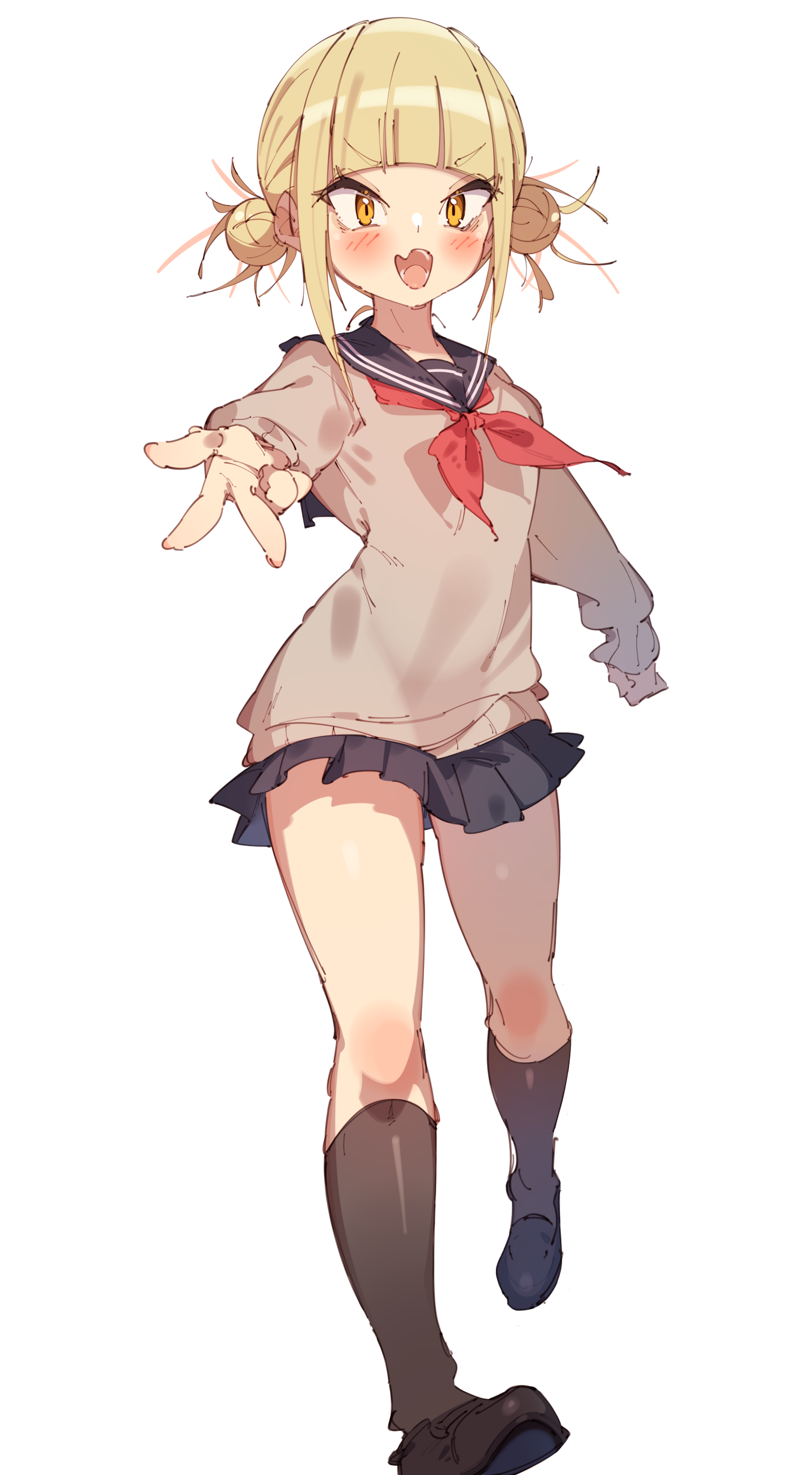 1girl absurdres black_sailor_collar black_shoes black_skirt blonde_hair blunt_bangs blush boku_no_hero_academia brown_socks brown_sweater collarbone double_bun fang foreshortening full_body hair_bun highres loafers long_sleeves looking_at_viewer neckerchief open_mouth outstretched_arms pleated_skirt rasusurasu red_neckerchief sailor_collar shoes short_eyebrows short_hair_with_long_locks sidelocks simple_background skin_fang skirt smile socks solo sweater toga_himiko tsurime v-shaped_eyebrows walking white_background yellow_eyes