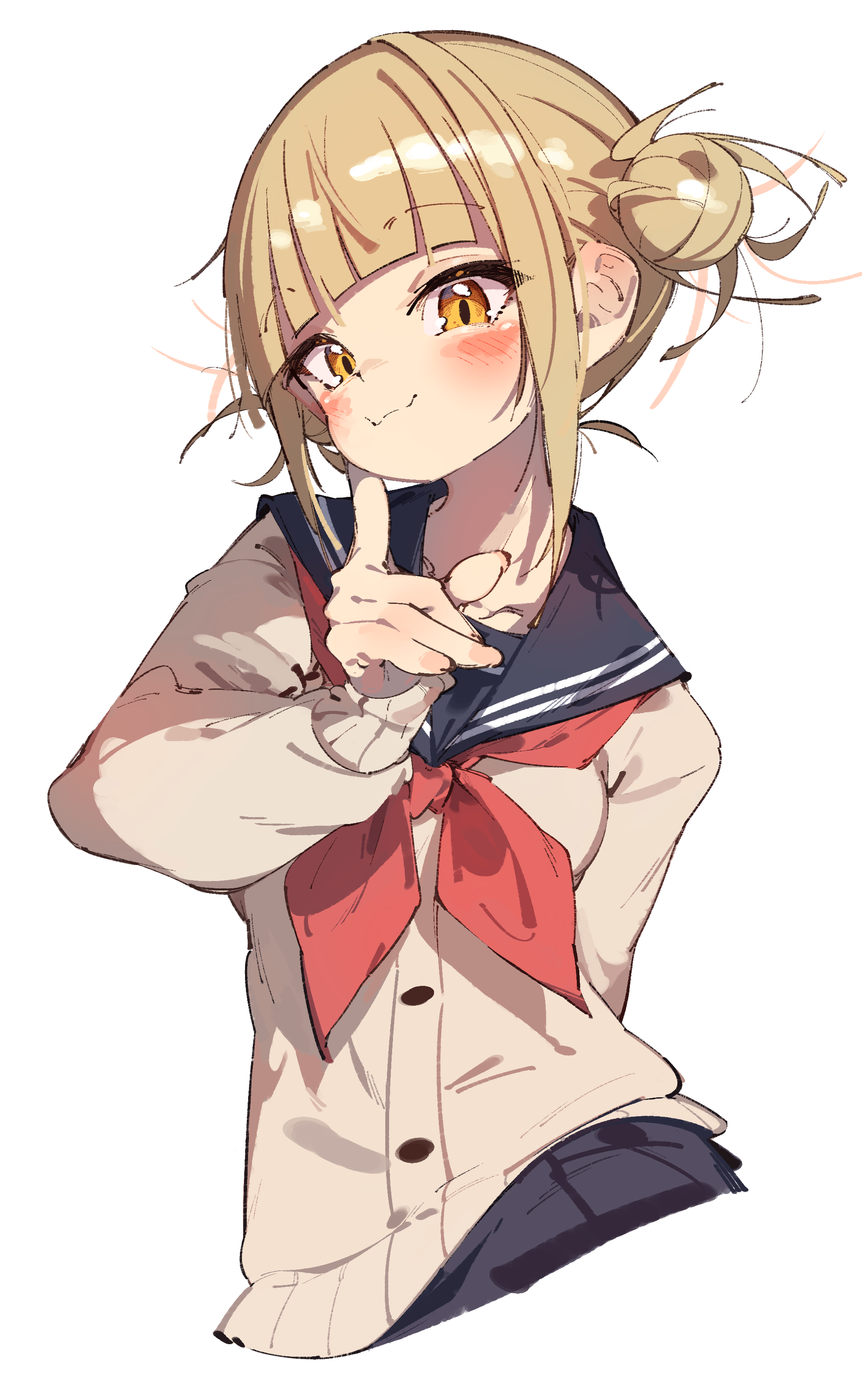 1girl :3 absurdres arm_behind_back black_sailor_collar black_skirt blonde_hair blunt_bangs blush boku_no_hero_academia breasts brown_cardigan cardigan closed_mouth collarbone cropped_legs double_bun hair_bun hand_on_own_face highres index_finger_raised long_sleeves looking_at_viewer neckerchief pleated_skirt rasusurasu red_neckerchief sailor_collar short_hair_with_long_locks sidelocks simple_background skirt small_breasts solo toga_himiko white_background yellow_eyes
