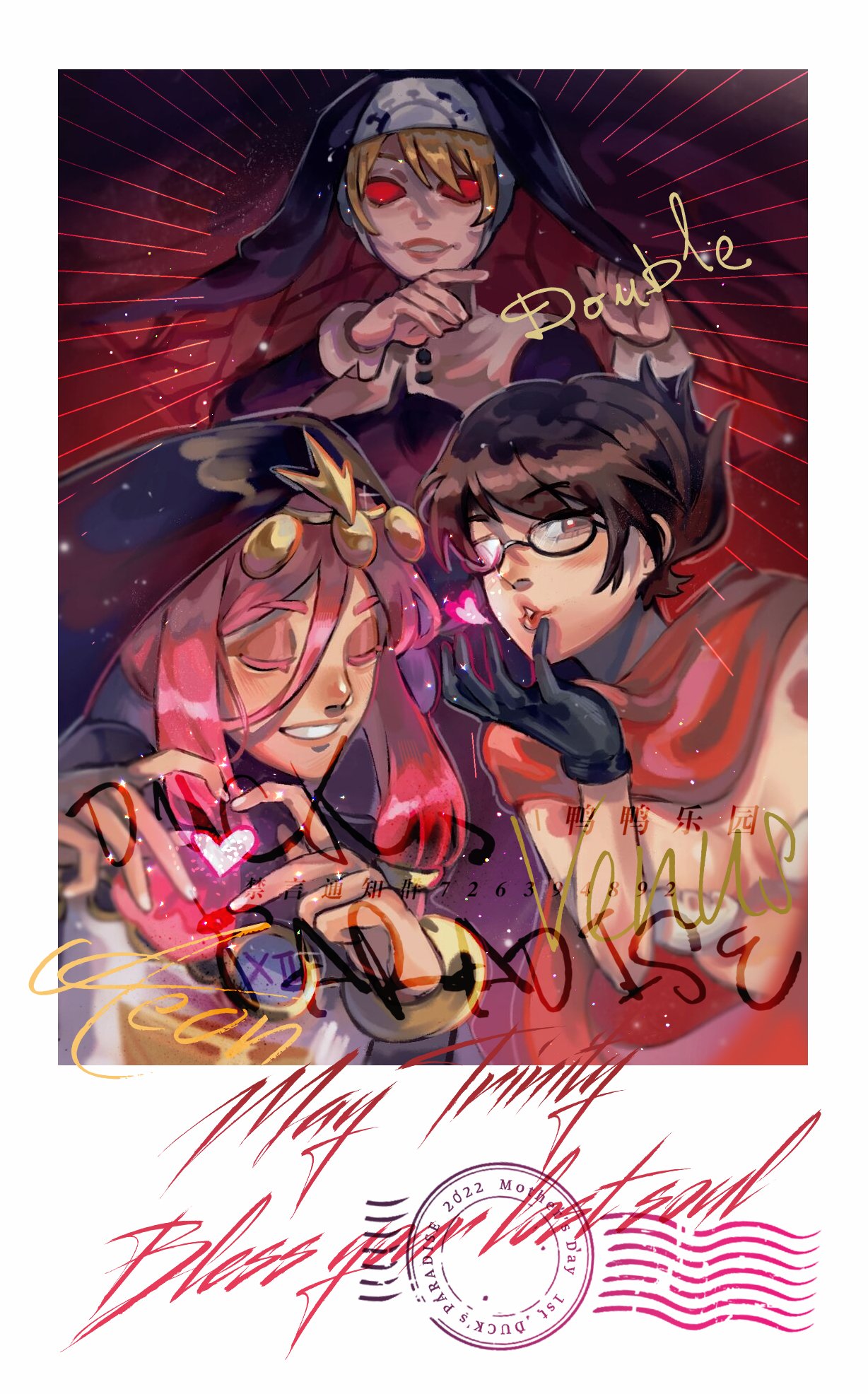 3girls aeon_(skullgirls) blank_eyes blonde_hair blowing_kiss blush brown_hair character_name double_(skullgirls) glasses heart heart_hands highres looking_at_viewer marysue multiple_girls nun pink_hair ponytail postcard red_eyes scarf siblings sisters skullgirls smile tiara venus_(skullgirls)