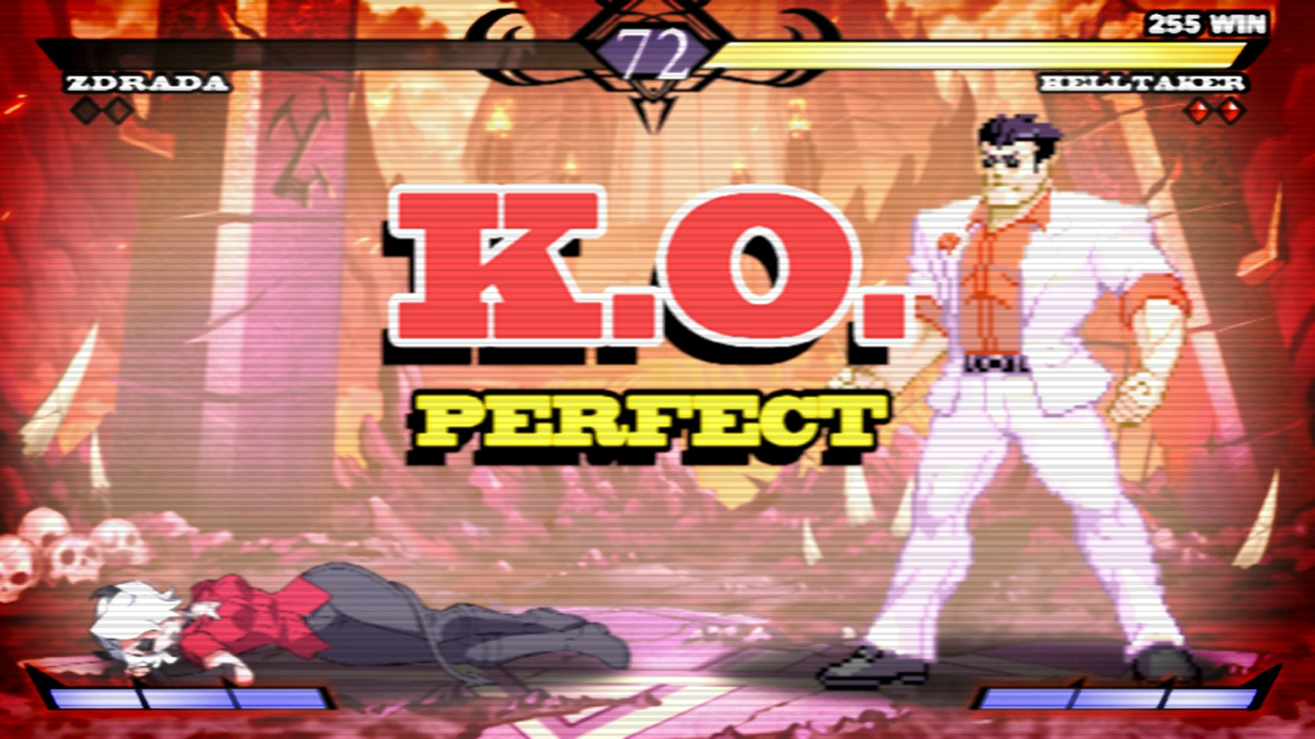 1boy 1girl black_hair blouse demon_girl demon_horns english_text fake_screenshot fan_game fighting_game formal_clothes helltaker helltaker_(character) hellversus highres horns kyo-hei_(kyouhei) muscular muscular_male red_shirt scanlines shirt suit white_hair white_suit zdrada_(helltaker)