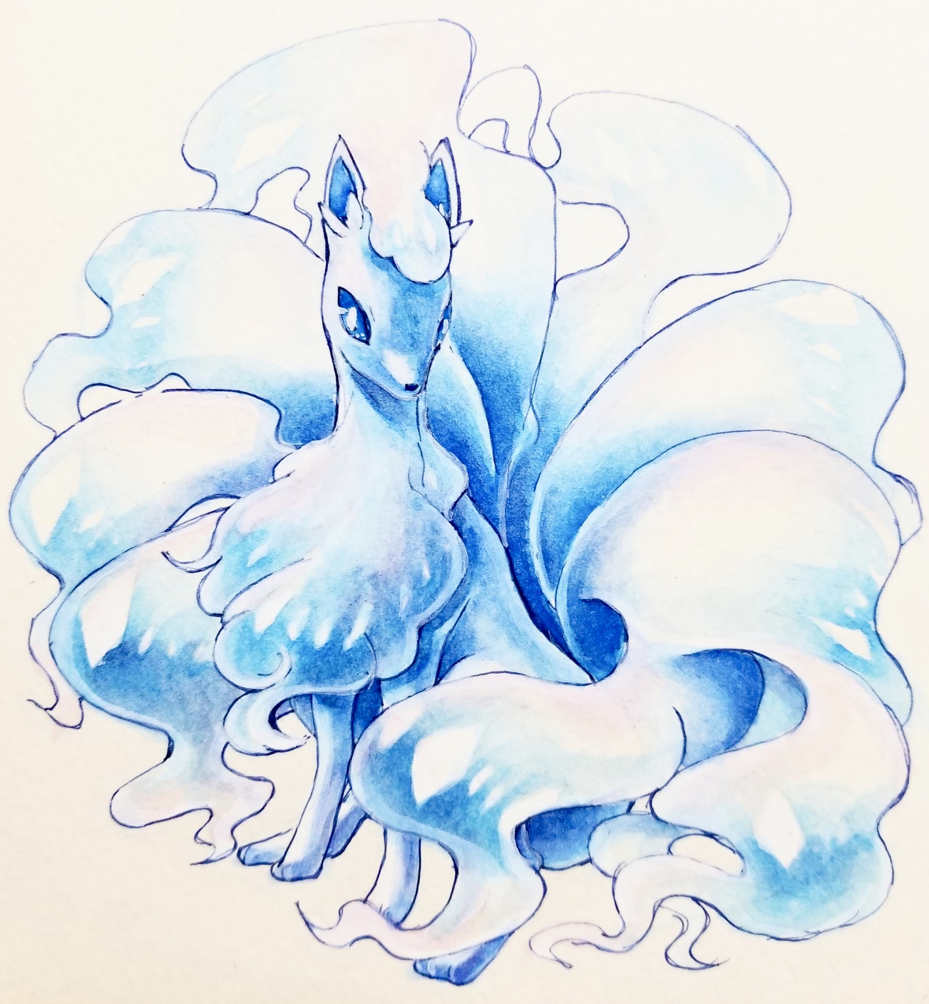 alolan_form alolan_ninetales blue_eyes bright_pupils commentary_request full_body gen_7_pokemon highres looking_at_viewer masshu_(shu_123426) nintendo no_humans painting_(medium) pokemon pokemon_(creature) pokemon_focus sitting solo toes traditional_media watercolor_(medium) white_pupils