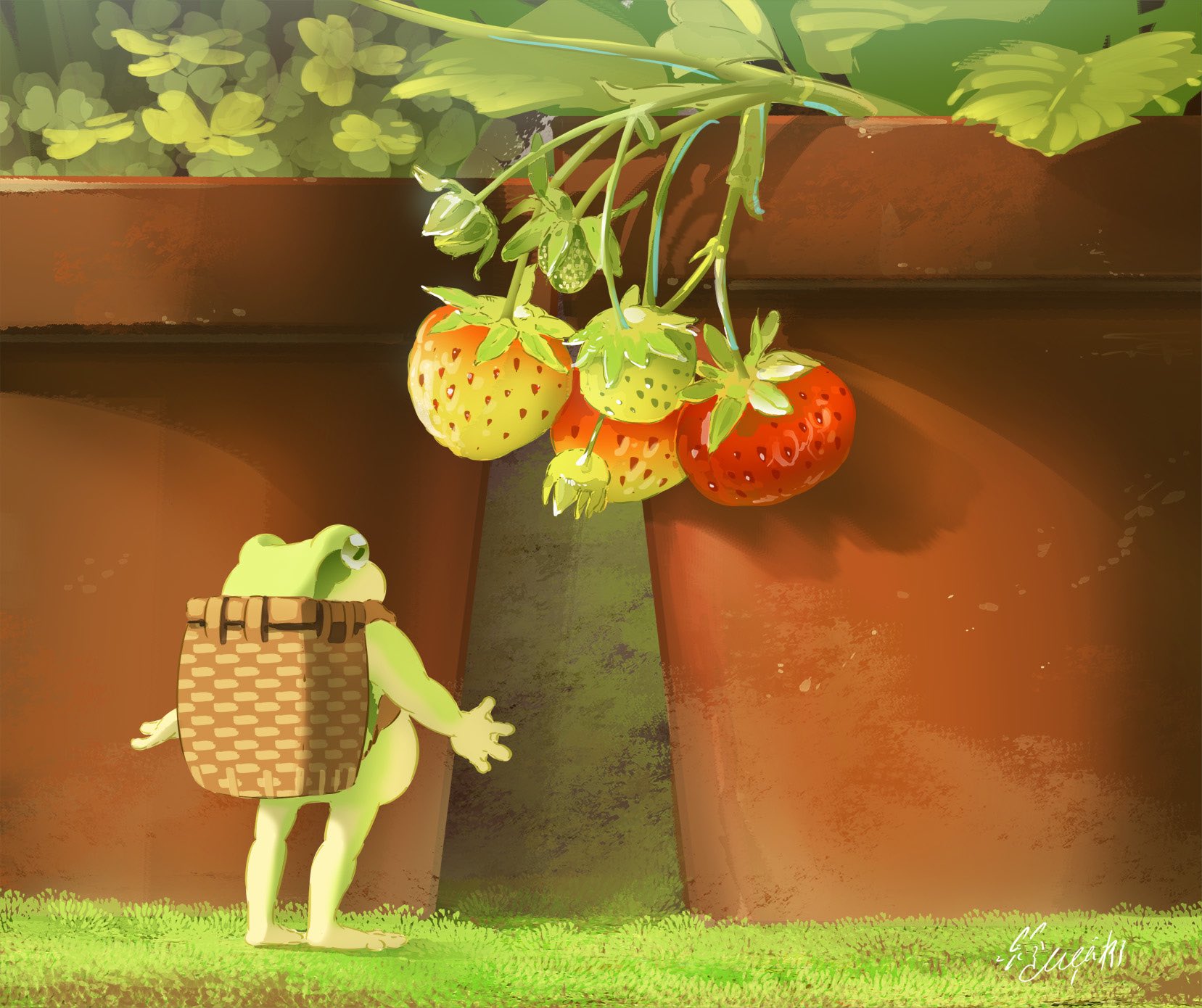 1other backpack_basket basket commentary_request day flower_pot food frog from_behind fruit full_body grass hachiya_shohei highres holding holding_basket looking_up no_humans original outdoors plant potted_plant strawberry extendable_limbs
