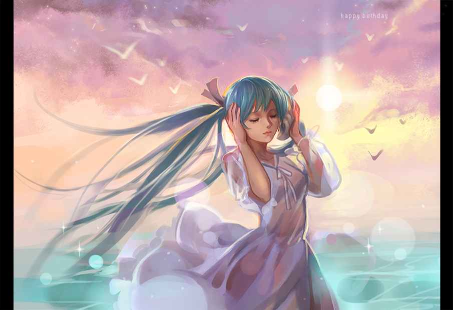 1girl blue_hair closed_eyes closed_mouth collarbone day dress floating_hair hair_ribbon haitu hand_on_own_ear happy_birthday hatsune_miku lens_flare long_hair neck_ribbon ocean outdoors pink_ribbon ribbon see-through_clothes see-through_sleeves solo sparkle standing sun sunlight very_long_hair vocaloid white_dress white_ribbon