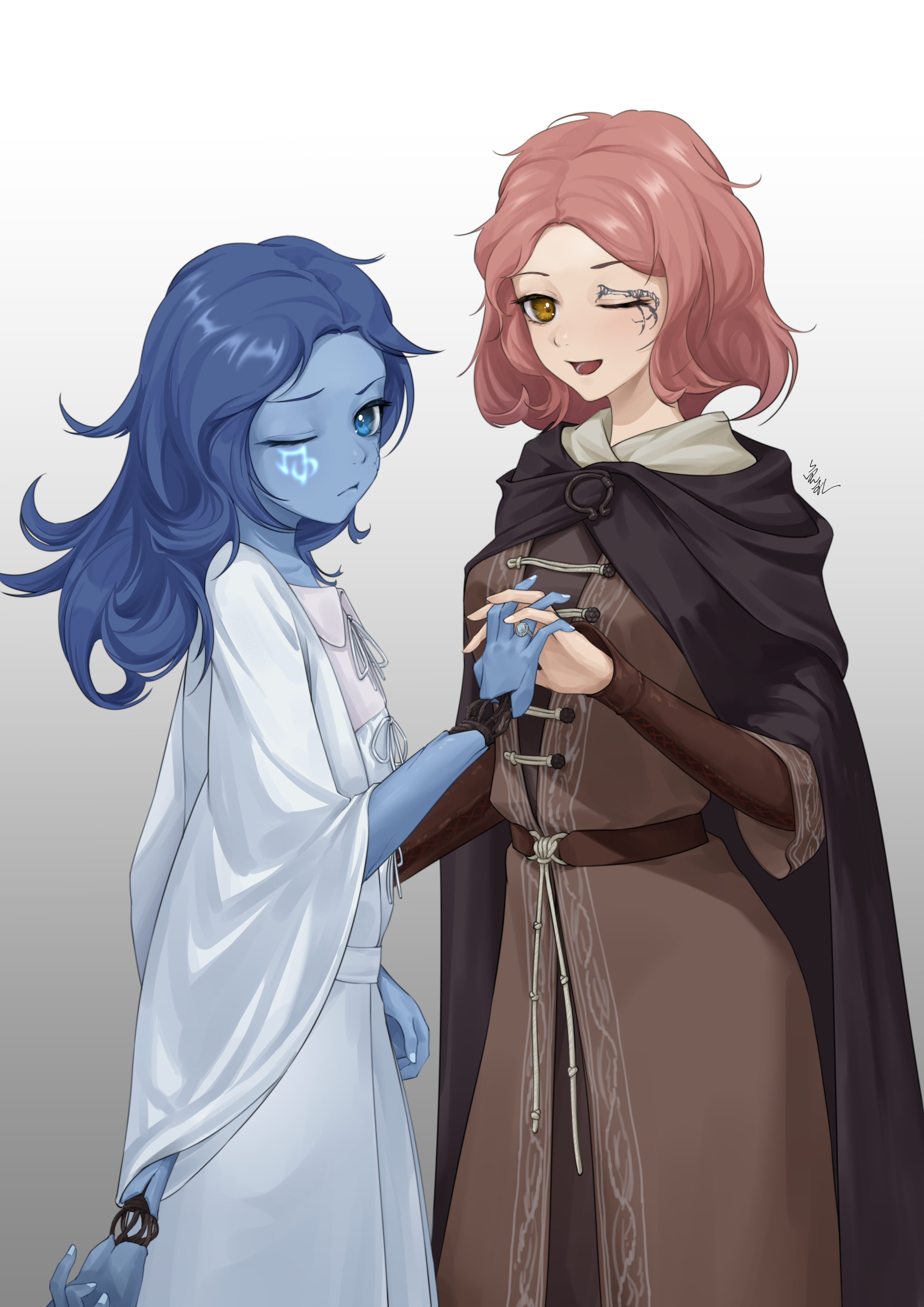 2girls absurdres black_cloak blue_eyes blue_hair blue_skin brown_hair brown_tunic cloak closed_eyes colored_skin cracked_skin doll_joints dress elden_ring extra_arms facial_tattoo highres interlocked_fingers joints looking_at_viewer melina_(elden_ring) mian_li multiple_girls ranni_the_witch tattoo tunic white_dress
