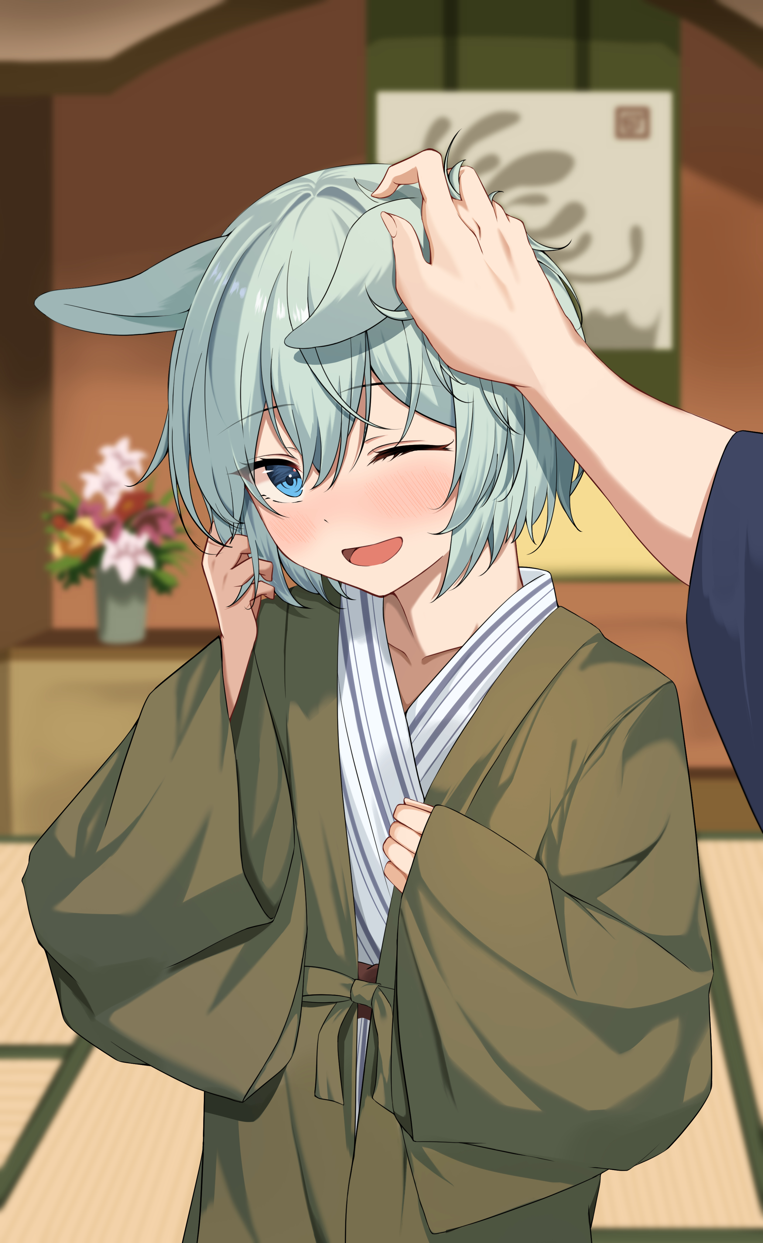 1boy 1girl :d absurdres animal_ears blue_eyes blurry blurry_background cathy_idx flower green_hair green_kimono headpat highres horse_ears horse_girl indoors japanese_clothes kimono long_sleeves looking_at_viewer one_eye_closed open_mouth pink_flower purple_flower seiun_sky_(umamusume) short_hair smile trainer_(umamusume) umamusume vase yellow_flower