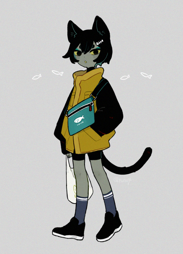 1girl animal_ears bag black_eyes black_footwear black_hair black_sweater blue_hair blue_legwear cat_ears cat_girl cat_tail colored_inner_hair colored_sclera colored_skin fish_hair_ornament full_body grey_background grey_skin hair_between_eyes hair_ornament hand_in_pocket holding holding_bag jacket kneehighs long_sleeves looking_at_viewer multicolored_hair original plastic_bag short_eyebrows short_hair sleeveless sleeveless_jacket socks solo sumi_(yotsukado) sweater tail turtleneck two-tone_hair walking yellow_jacket yellow_sclera
