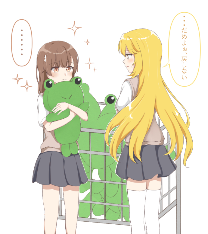 2022 20s 2girls blonde_hair blouse brown_eyes brown_hair brown_vest commentary_request gekota grey_skirt hair_ornament hairpin hugging_doll hugging_object japanese_text long_hair looking_at_another matching_hair/eyes misaka_mikoto multiple_girls school_uniform shirt shokuhou_misaki short_hair short_sleeves skirt socks sparkle standing stuffed_animal stuffed_toy summer_uniform sweater_vest swkanon0419 thighhighs toaru_kagaku_no_railgun toaru_majutsu_no_index tokiwadai_school_uniform translation_request vest white_shirt white_socks yellow_eyes zettai_ryouiki