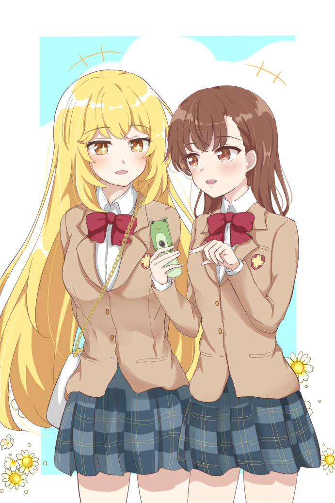 2girls arms_behind_back bag blazer blonde_hair blue_skirt blush bow bowtie brown_eyes brown_hair brown_jacket cellphone chain commentary_request flip_phone gekota hair_ornament hairpin holding holding_phone jacket long_hair long_sleeves misaka_mikoto multiple_girls open_mouth phone plaid_clothes plaid_skirt red_bow red_bowtie school_uniform shokuhou_misaki short_hair skirt swkanon0419 toaru_kagaku_no_mental_out toaru_kagaku_no_railgun toaru_majutsu_no_index tokiwadai_school_uniform