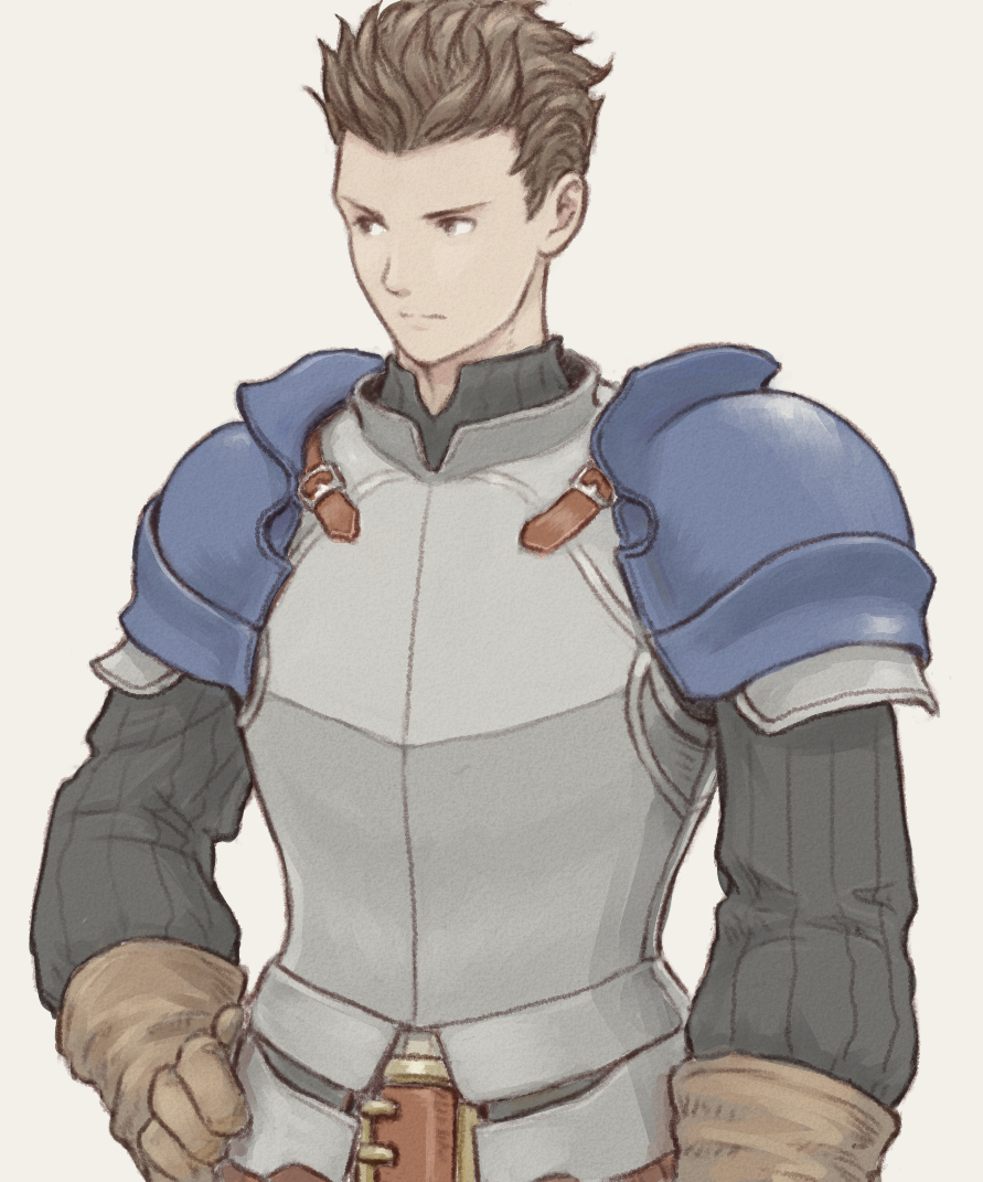 1boy armor brown_eyes brown_gloves brown_hair gloves hand_on_own_hip long_sleeves simple_background solo tactics_ogre upper_body vice_bozeg white_background windcaller