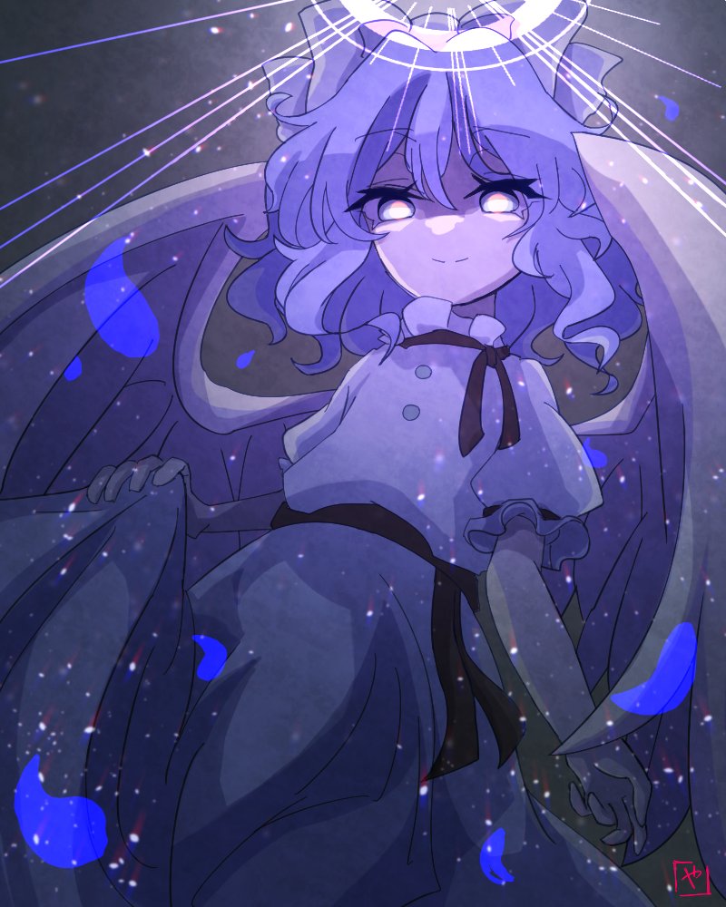 1girl angel_wings black_ribbon black_sash blue_eyes blue_hair bow buttons closed_mouth commentary_request dress eyelashes feathered_wings glowing glowing_eyes hair_bow halo happy holding_own_dress looking_at_viewer mai_(touhou) neck_ribbon otoya_sindoi puffy_short_sleeves puffy_sleeves ribbon sash short_hair short_sleeves smile solo touhou touhou_(pc-98) white_bow white_dress white_wings wings