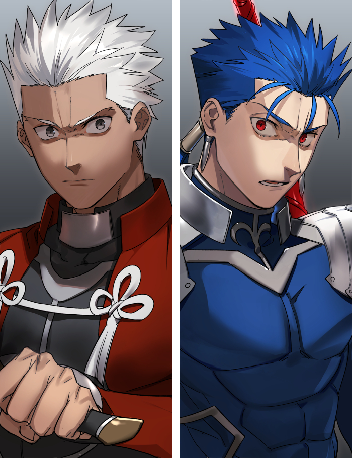 2boys angry archer_(fate) armor blue_hair cu_chulainn_(fate) cu_chulainn_(fate/stay_night) cu_chulainn_(lancer)_(fate) earrings fate/stay_night fate_(series) gae_bolg_(fate) gradient_background grey_background grey_eyes hair_tubes ichimatsuinfo jewelry kanshou_&_bakuya_(fate) looking_at_viewer low_ponytail male_focus multiple_boys ponytail red_eyes white_hair