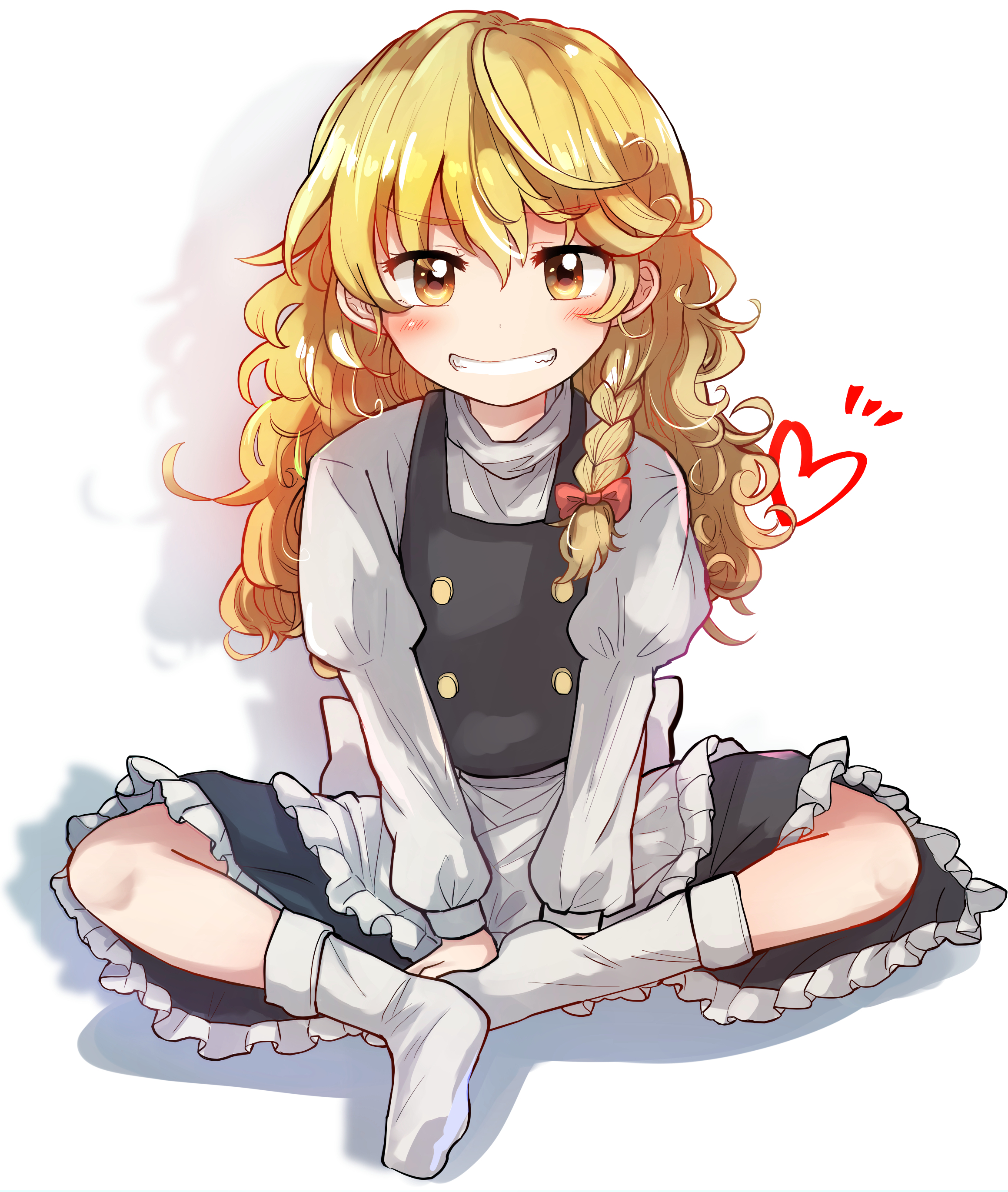 1girl absurdres apron blonde_hair blush braid grin highres indian_style kirisame_marisa long_hair long_sleeves looking_at_viewer missing_headwear no_headwear no_shoes single_braid sitting skirt smile socks solo tigern touhou vest waist_apron wavy_hair white_socks yellow_eyes