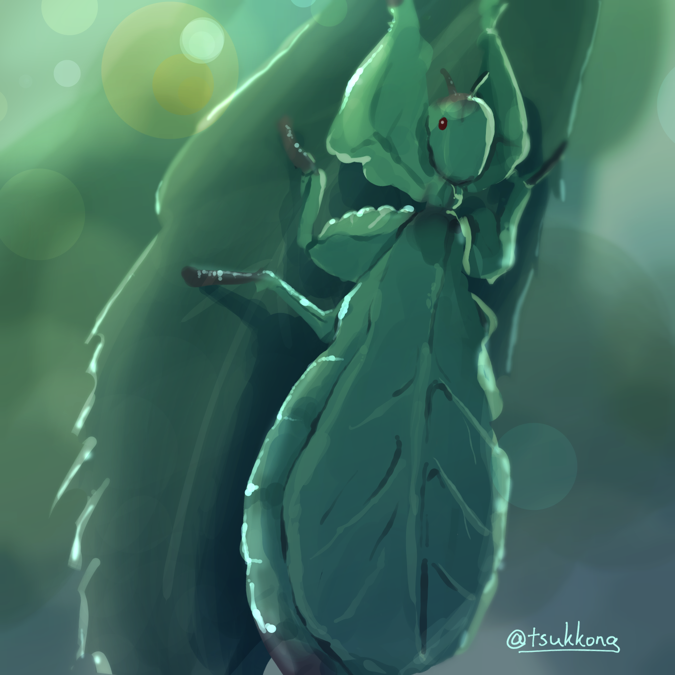 animal_focus artist_name blurry blurry_background bokeh depth_of_field full_body green_background green_theme highres leaf leaf_insect no_humans original outdoors red_eyes signature sketch tsukkon twitter_username