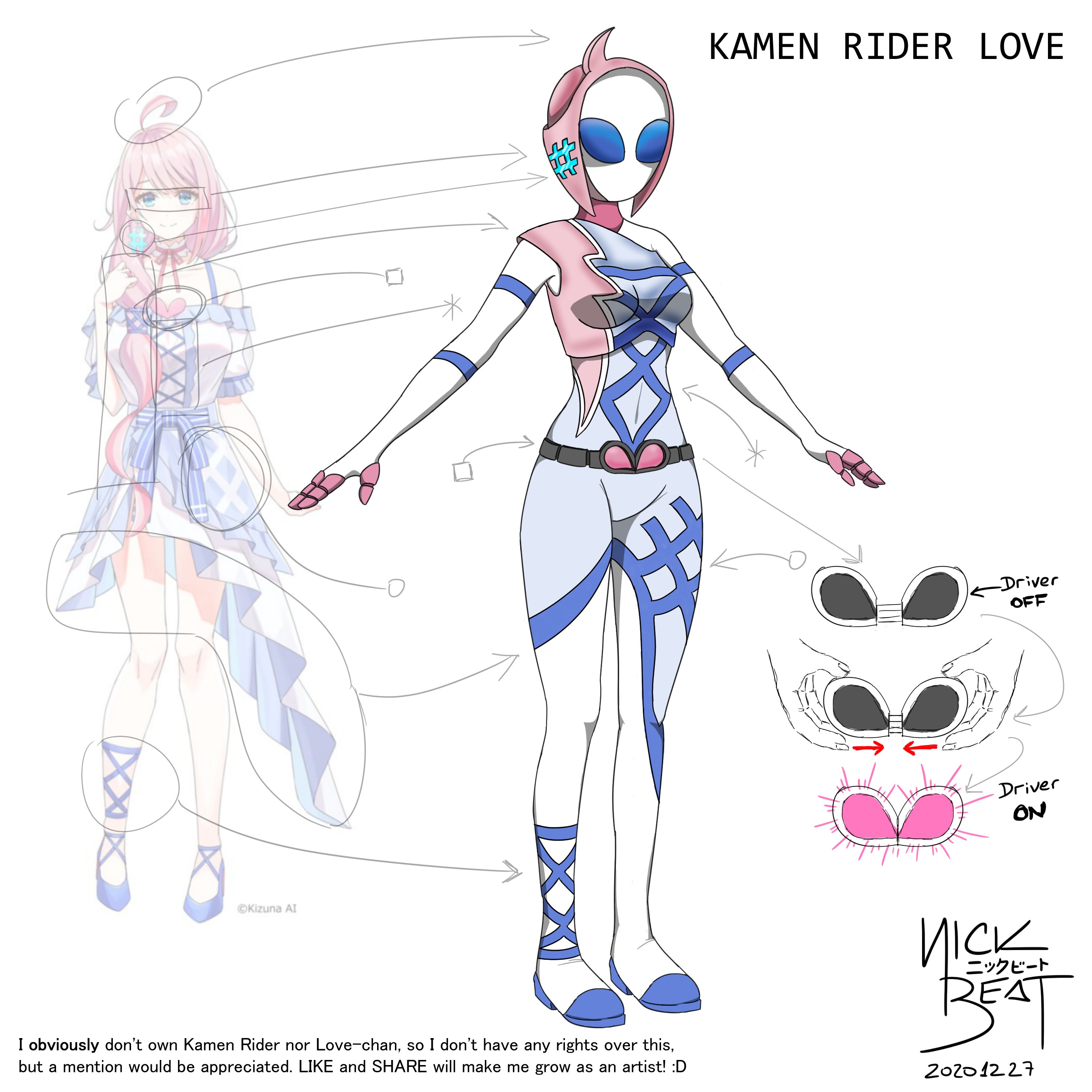 1girl absurdres artist_name belt black_belt blue_bodysuit blue_headwear bodysuit commentary copyright_notice dated english_commentary english_text full_body hashtag helmet highres kamen_rider kizuna_ai_inc. koh_rd love=charmulet love-pii_channel multicolored_bodysuit multicolored_headwear nickbeat official_art_inset original pink_bodysuit pink_headwear rider_belt signature standing tokusatsu virtual_youtuber white_bodysuit white_headwear