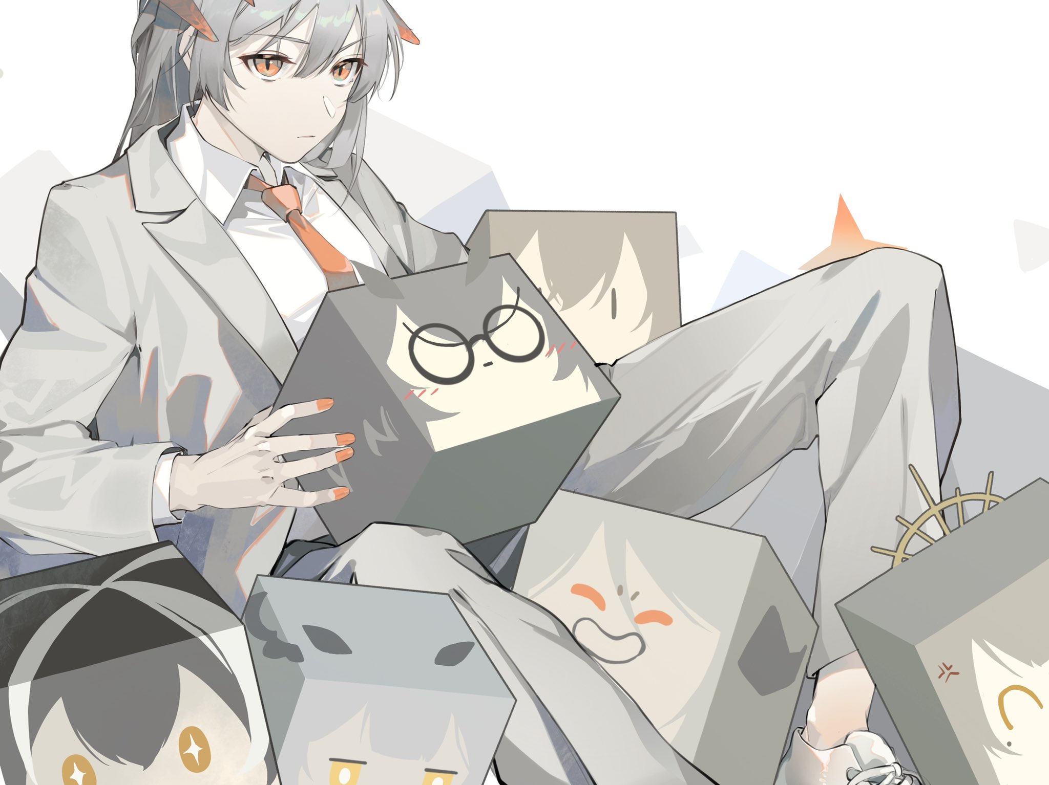 1girl ^_^ alternate_costume anger_vein arknights blouse closed_eyes collared_shirt cronostasis2333 cube dragon_girl dragon_horns dress_shirt formal_clothes grey_hair grey_jacket grey_pants hair_between_eyes highres holding_cube horns ifrit_(arknights) jacket long_hair long_sleeves looking_at_viewer magallan_(arknights) mayer_(arknights) muelsyse_(arknights) necktie open_clothes open_jacket orange_eyes orange_necktie pants ptilopsis_(arknights) saria_(arknights) shirt shoes silence_(arknights) simple_background solo suit_jacket white_background white_shirt white_shoes