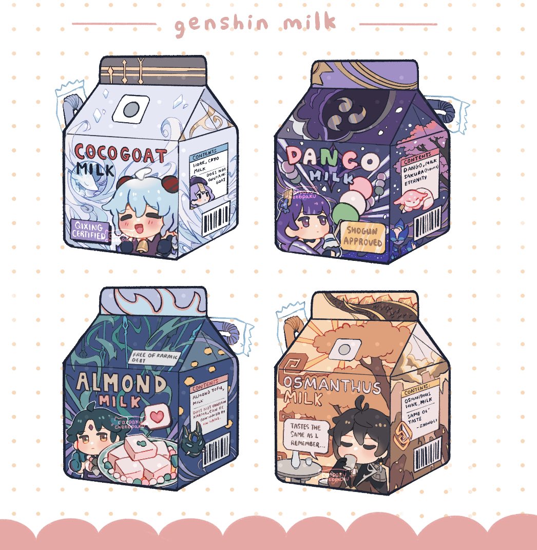 animal barcode black_hair blue_hair blush closed_eyes commentary cup dango drink_carton drinking drinking_straw earrings english_commentary english_text facial_mark food forehead_mark ganyu_(genshin_impact) genshin_impact gloves hair_ornament heart horns jewelry long_hair milk_carton open_mouth paku_(cheebpaku) purple_hair qiqi_(genshin_impact) raiden_shogun sanshoku_dango single_earring thumbs_up wagashi watermark xiao_(genshin_impact) yae_miko yae_miko_(fox) zhongli_(genshin_impact)