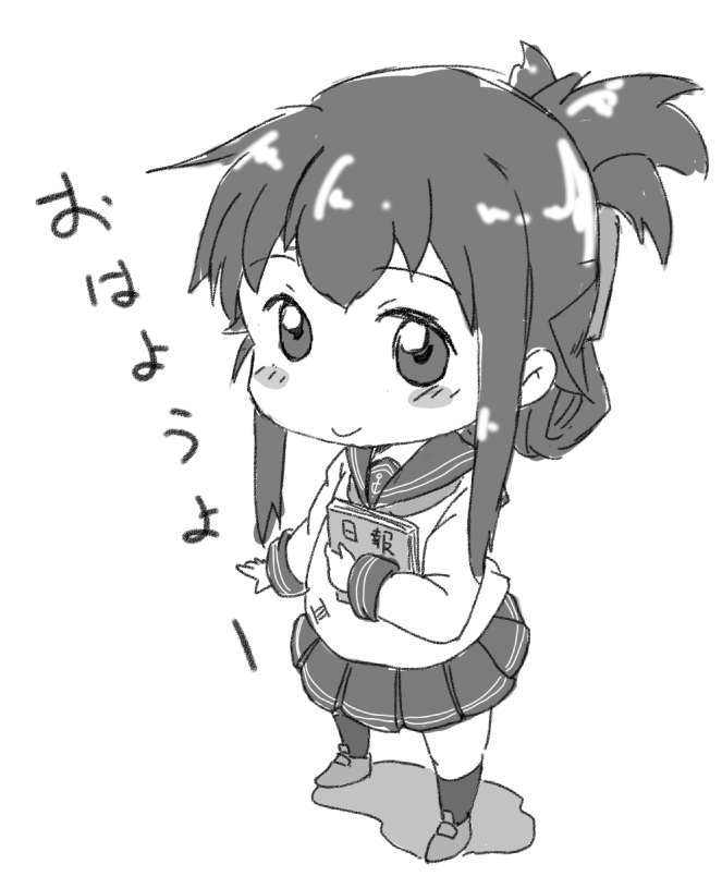 1girl anchor_symbol folded_ponytail greyscale inazuma_(kancolle) kantai_collection kneehighs long_hair monochrome neckerchief pleated_skirt school_uniform serafuku skirt socks solo standing zatsu_(zasshu_neko)