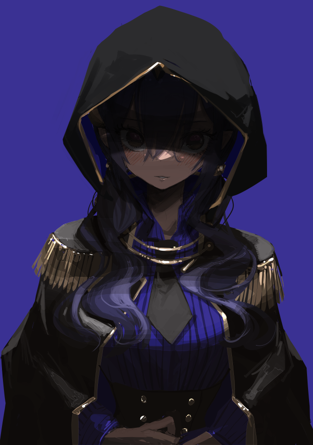 1girl black_necktie blouse blue_background blue_shirt blush coat coat_on_shoulders dark-skinned_female dark_skin epaulettes hair_between_eyes hood hood_up looking_at_viewer narue necktie original parted_lips purple_hair shaded_face shirt short_necktie simple_background smile solo upper_body