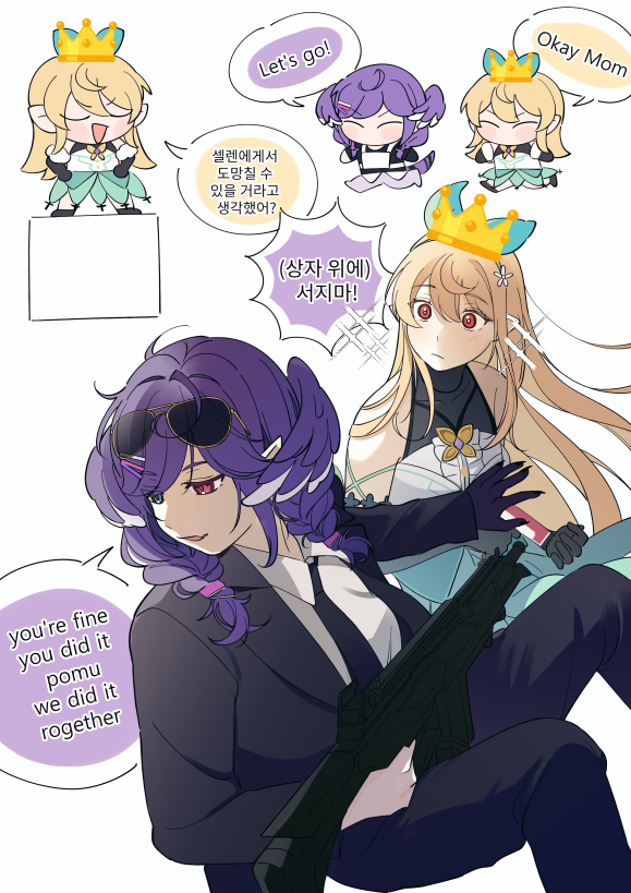 2girls black_jacket black_pants blonde_hair blouse blue_necktie blush braid brown_eyes crown elirasuki english_text green_ribbon green_skirt gun hair_ribbon halter_shirt halterneck head_wings holding holding_gun holding_weapon jacket korean_text long_hair multiple_girls necktie nijisanji nijisanji_en pants pointy_ears pomu_rainpuff purple_hair ribbon selen_tatsuki shirt skirt speech_bubble surprised translation_request twin_braids virtual_youtuber weapon white_shirt wings