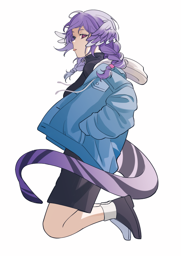 1girl airborne black_shorts black_sweater blue_eyes blue_jacket breasts dragon_girl dragon_tail elirasuki from_side head_wings heterochromia hood hooded_jacket jacket medium_breasts nijisanji nijisanji_en purple_eyes purple_hair selen_tatsuki shorts solo sweater tail tongue tongue_out virtual_youtuber wings
