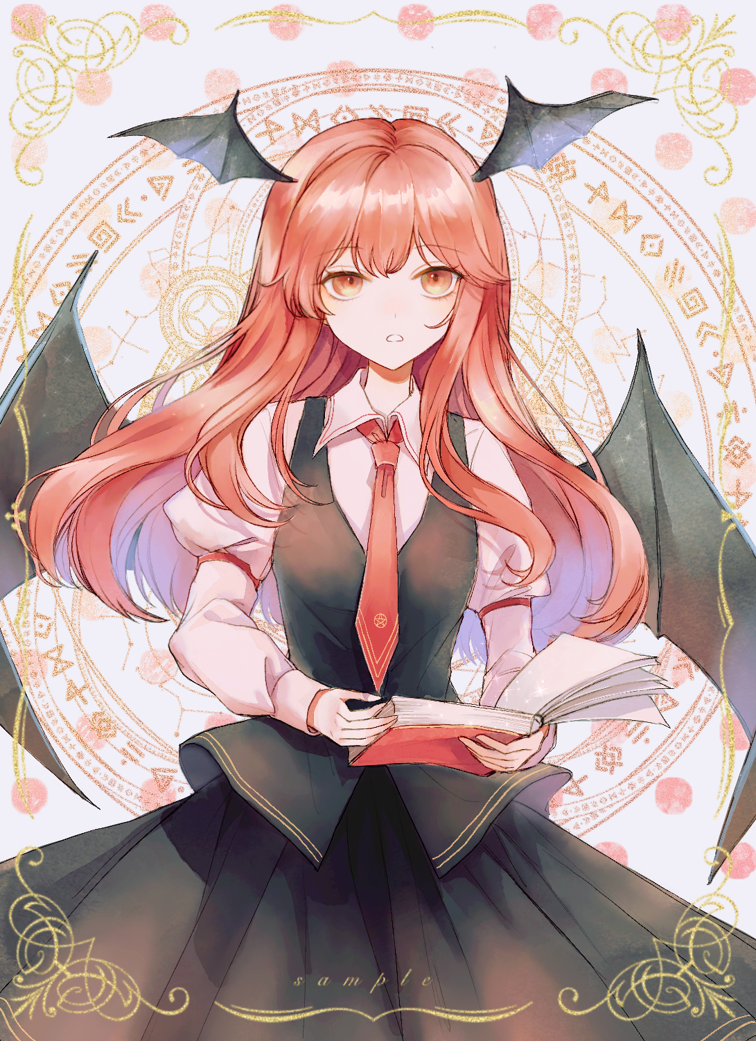 1girl black_skirt blouse book breasts cowboy_shot head_wings highres holding holding_book hourai_kiriri juliet_sleeves koakuma long_hair long_sleeves looking_at_viewer necktie puffy_sleeves red_eyes red_hair shirt skirt skirt_set solo touhou vest white_shirt wings
