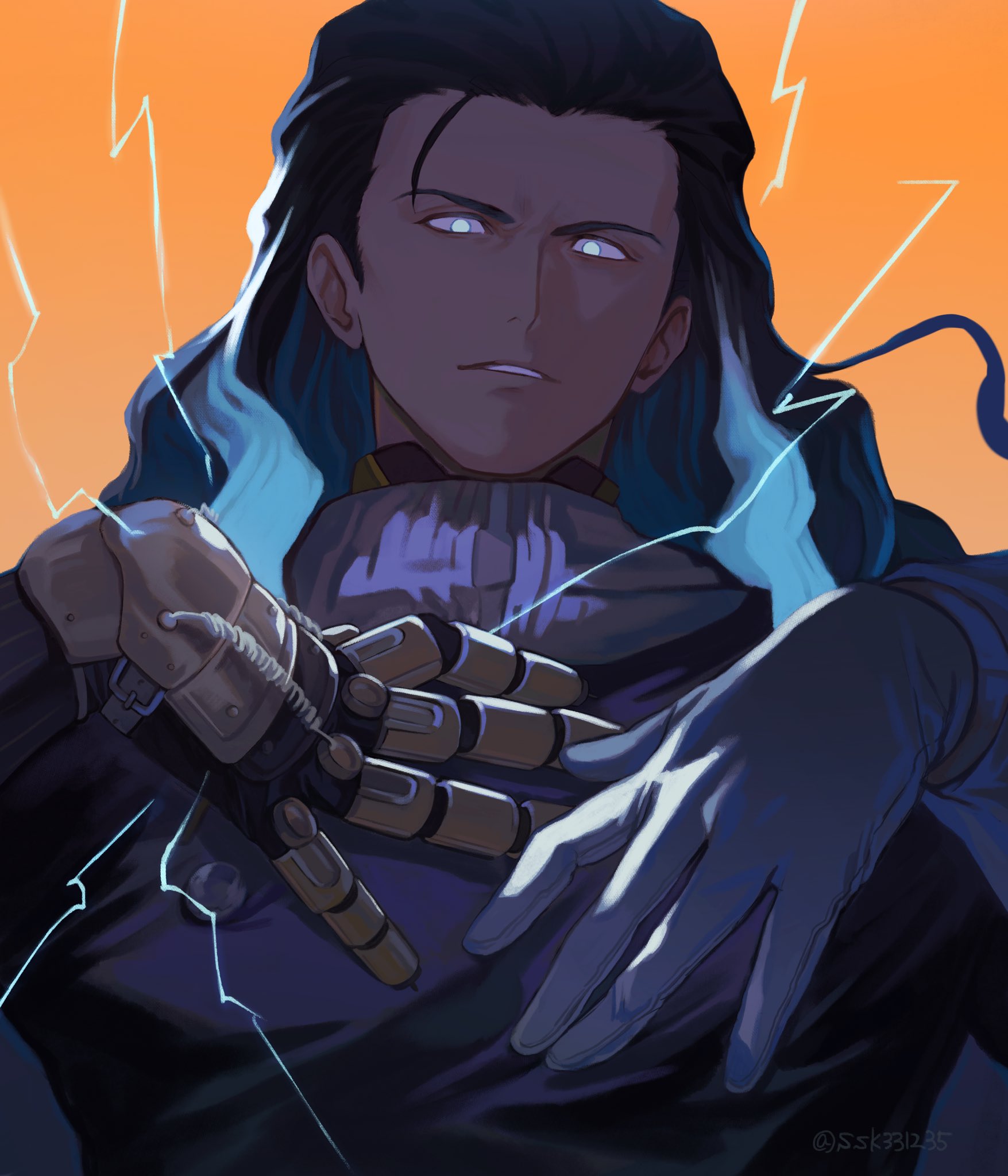 1boy black_hair blue_eyes blue_hair commentary_request electricity fate/grand_order fate_(series) gloves glowing glowing_eyes gradient_hair hands_on_own_chest highres lightning long_hair long_sleeves looking_at_viewer male_focus mechanical_arms multicolored_hair nikola_tesla_(fate) orange_background simple_background single_mechanical_arm smile solo sosaka teeth upper_body white_gloves