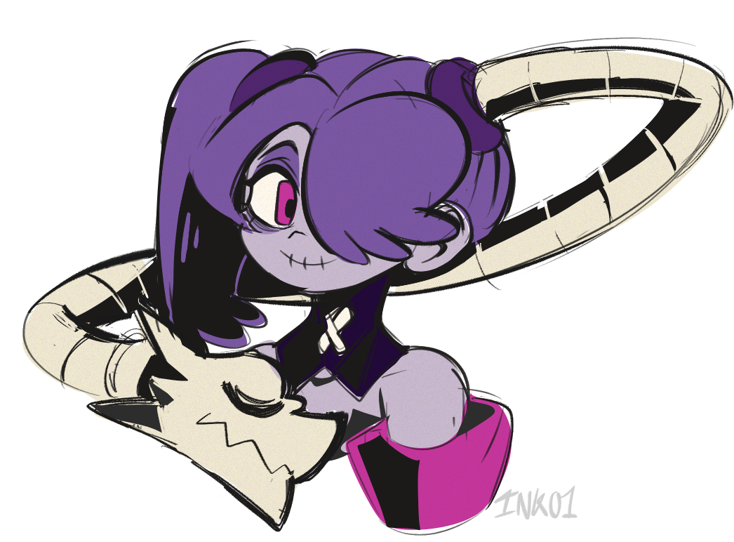 1boy 1girl 2020 alternate_color artist_name bags_under_eyes clip_studio_paint_(medium) closed_eyes detached_collar detached_sleeves hair_over_one_eye ink_(ink01_) leviathan_(skullgirls) looking_at_viewer looking_to_the_side one_eye_covered one_side_up portrait purple_eyes purple_hair skullgirls squigly_(skullgirls) stitched_mouth stitches white_background zombie