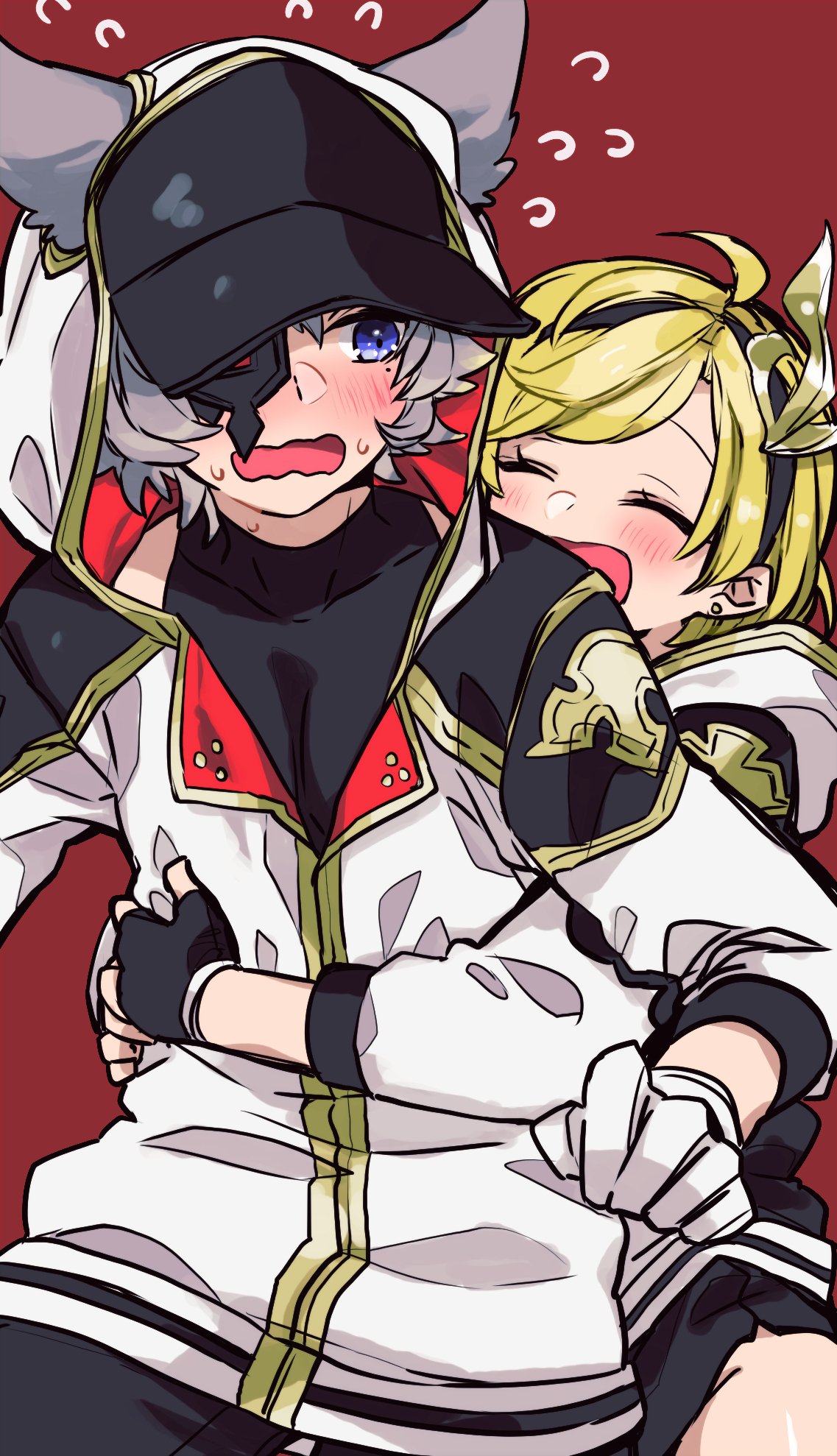 1boy 1girl ^_^ alternate_costume animal_ears baseball_cap black_gloves black_pants black_shorts blonde_hair blue_eyes blush closed_eyes djeeta_(granblue_fantasy) ears_through_headwear erune closed_eyes fingerless_gloves flying_sweatdrops gloves granblue_fantasy grey_hair hairband half_mask hat highres hood hood_down hood_up hooded_jacket hug hug_from_behind jacket long_sleeves mask mole mole_under_eye open_mouth osakana_(rrg0123) pants red_background seox_(granblue_fantasy) short_hair shorts simple_background sweat upper_body wavy_mouth white_gloves white_jacket