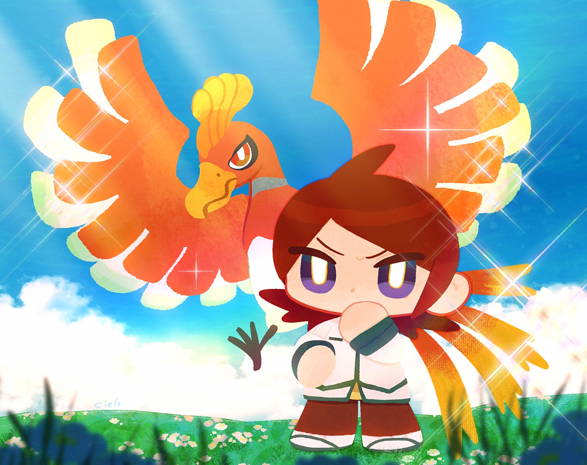 1girl bird blue_sky blurry blurry_foreground brown_shirt chibi cloud commentary_request day depth_of_field flower gen_2_pokemon grass hand_up ho-oh jacket kiduta_cielo legendary_pokemon looking_at_viewer nintendo outdoors pants parted_bangs pokemon pokemon_masters_ex purple_eyes red_eyes red_hair red_pants shirt silver_(pokemon) sky sparkle standing v-shaped_eyebrows white_flower white_jacket
