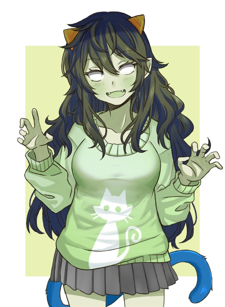 1girl black_hair blank_eyes cat_tail colored_skin fangs grey_skin homestuck horns long_hair meulin_leijon orange_horns paw_pose print_sweater skirt smile sweater tail troll_(homestuck) ximsol182 yellow_background