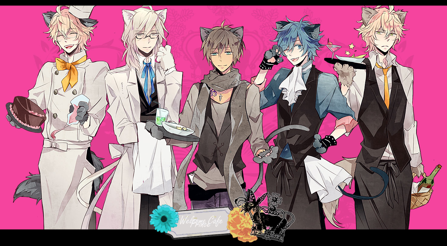 5boys :d ;d ahoge aijima_cecil animal_ears animal_hands apron aqua_flower ascot basket belt_pouch bespectacled black_apron black_pants black_vest blonde_hair blouse blue_eyes blue_hair blue_ribbon blue_shirt bottle bowl brown_hair cake camus_(uta_no_prince-sama) cat_ears cat_tail chef chef_hat chest_tattoo chocolate_cake coat cocktail_glass collared_shirt cowboy_shot crown_(symbol) cup dark-skinned_male dark_skin drinking_glass drinking_straw fake_animal_ears fingerless_gloves flower food gerbera glasses gloves green_eyes grey_eyes grey_scarf grey_shirt hair_between_eyes hand_on_own_hip hand_up hat holding holding_basket holding_pastry_bag holding_plate holding_tray ichinose_tokiya jewelry letterboxed lineup looking_at_viewer male_focus medium_hair multiple_boys neck_ribbon neckerchief necklace necktie one_eye_closed open_collar open_mouth oroku pants pastry_bag paw_gloves pink_background plate pouch purple_pants ribbon salute scarf scowl shinomiya_natsuki_(uta_no_prince-sama) shinomiya_satsuki shirt short_hair smile star_(symbol) tail tattoo teeth tilted_headwear towel tray two-finger_salute upper_teeth_only uta_no_prince-sama vest waist_apron waiter white_apron white_coat white_hair white_shirt wine_bottle wolf_ears wolf_tail yellow_flower yellow_neckerchief yellow_necktie