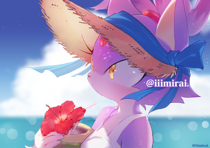 1girl alternate_costume animal_ears animal_nose artist_name bad_id bad_pixiv_id bare_shoulders blaze_the_cat blaze_the_cat_(summer) blue_ribbon blue_sky blurry blurry_background blush body_fur bokeh breasts brown_hat cat_ears cat_girl closed_mouth cloud coconut collarbone day depth_of_field dress drink drinking_straw female_focus flower forehead_jewel from_side fruit_as_cup furry furry_female gem hair_tie hands_up hat hat_ribbon hibiscus holding holding_drink horizon iiimirai light_blush multicolored_hair outdoors purple_fur purple_hair red_flower red_gem ribbon short_hair sky sleeveless sleeveless_dress small_breasts solo sonic_(series) straw_hat topknot twitter_username two-tone_fur two-tone_hair upper_body visor_cap watermark white_dress white_fur yellow_eyes