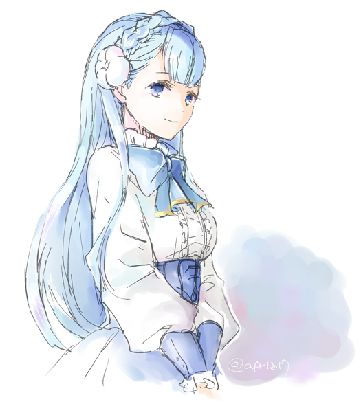 1girl blouse blue_bow blue_bowtie blue_eyes blue_hair blue_skirt bow bowtie braid closed_mouth crown_braid dress_shirt fire_emblem fire_emblem_echoes:_shadows_of_valentia long_hair long_sleeves nintendo rinea_(fire_emblem) robaco shirt simple_background sketch skirt smile solo twitter_username underbust very_long_hair white_background white_shirt