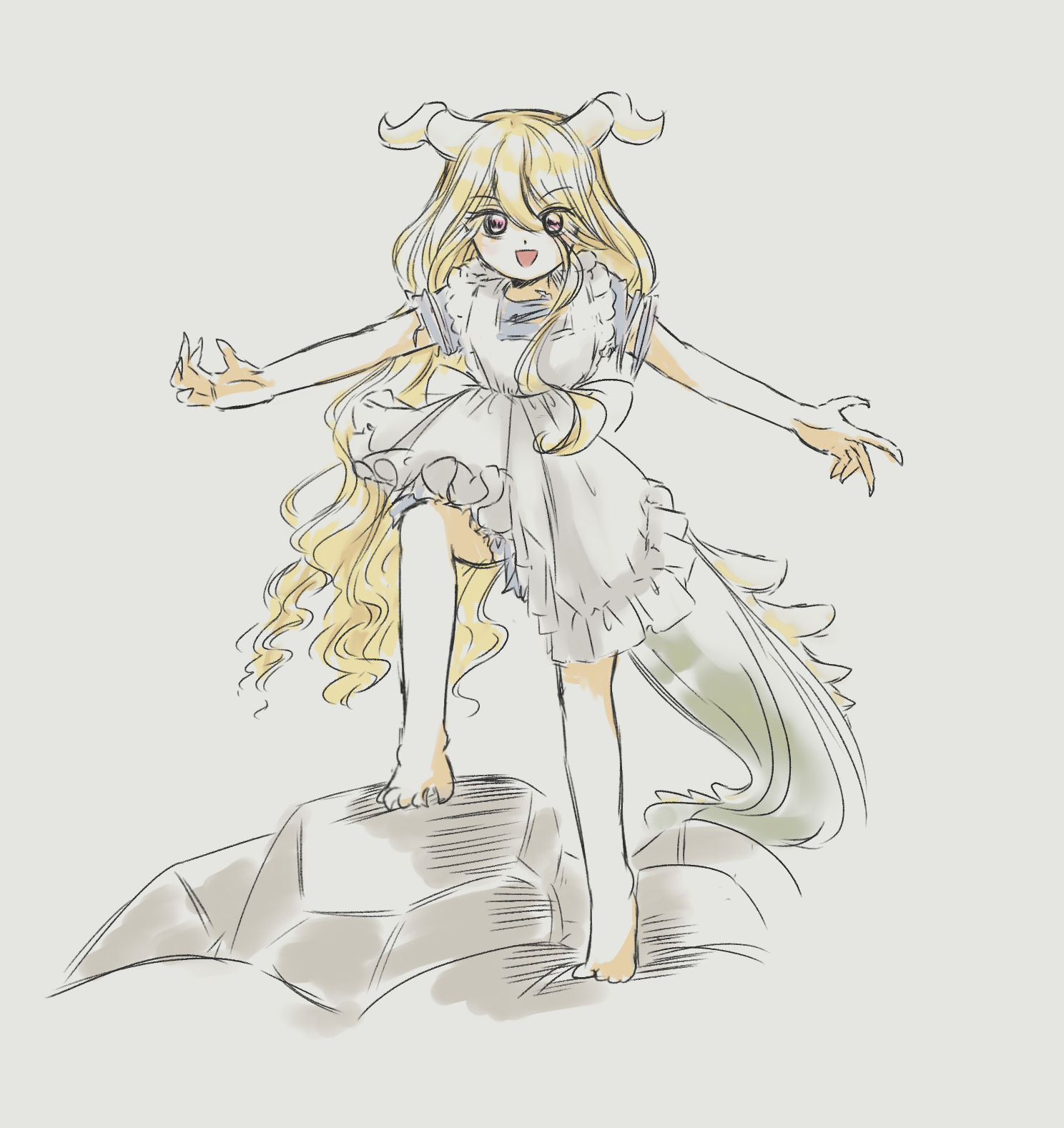 1980s_(style) 1girl apron bad_id bad_twitter_id barefoot blonde_hair claw_pose commentary_request dragon_tail feet frilled_apron frills highres horns long_hair oldschool open_mouth original outstretched_arms red_eyes retro_artstyle rock simple_background tail takemoto_izumi_(style) toes traditional_media very_long_hair white_apron white_background yatyou