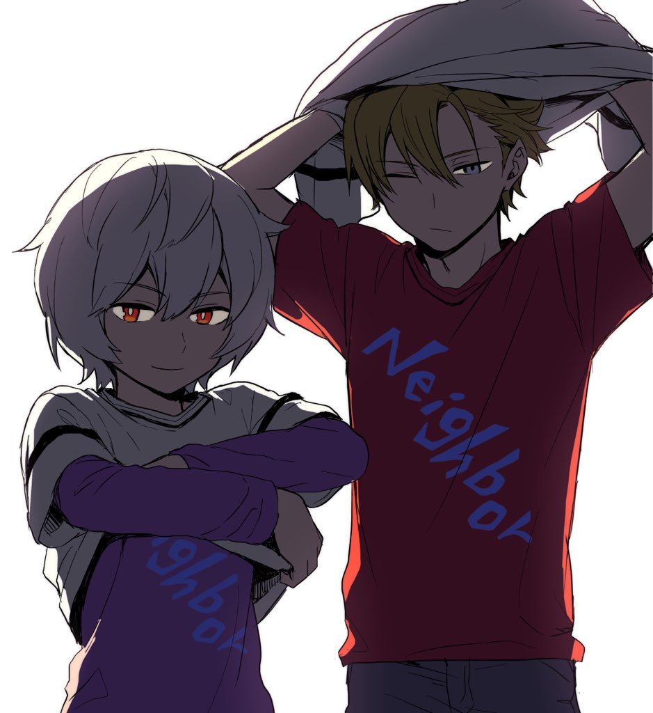 2boys 7100potechi arms_up backlighting blouse brown_hair clothes_writing hair_between_eyes hands_up hyuse kuga_yuuma layered_sleeves long_sleeves male_focus matching_outfits multiple_boys one_eye_closed purple_eyes purple_shirt red_eyes red_shirt shirt shirt_over_head short_hair short_over_long_sleeves short_sleeves simple_background smirk t-shirt undressing white_background white_hair world_trigger