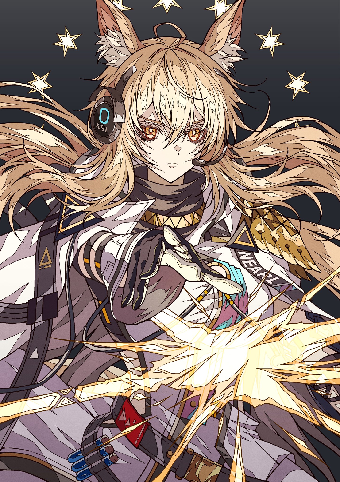 1girl animal_ear_fluff animal_ears arknights armor belt belt_buckle black_background black_gloves blonde_hair buckle character_name coat commentary_request dynamic_pose energy_spear energy_weapon facing_viewer female_focus gloves headset highres horse_ears horse_girl implied_extra_ears long_sleeves looking_at_viewer name_tag nearl_(arknights) nearl_the_radiant_knight_(arknights) outstretched_arm pauldrons reaching reaching_towards_viewer shokikanes shoulder_armor single_pauldron solo star_(symbol) vial white_coat yellow_eyes