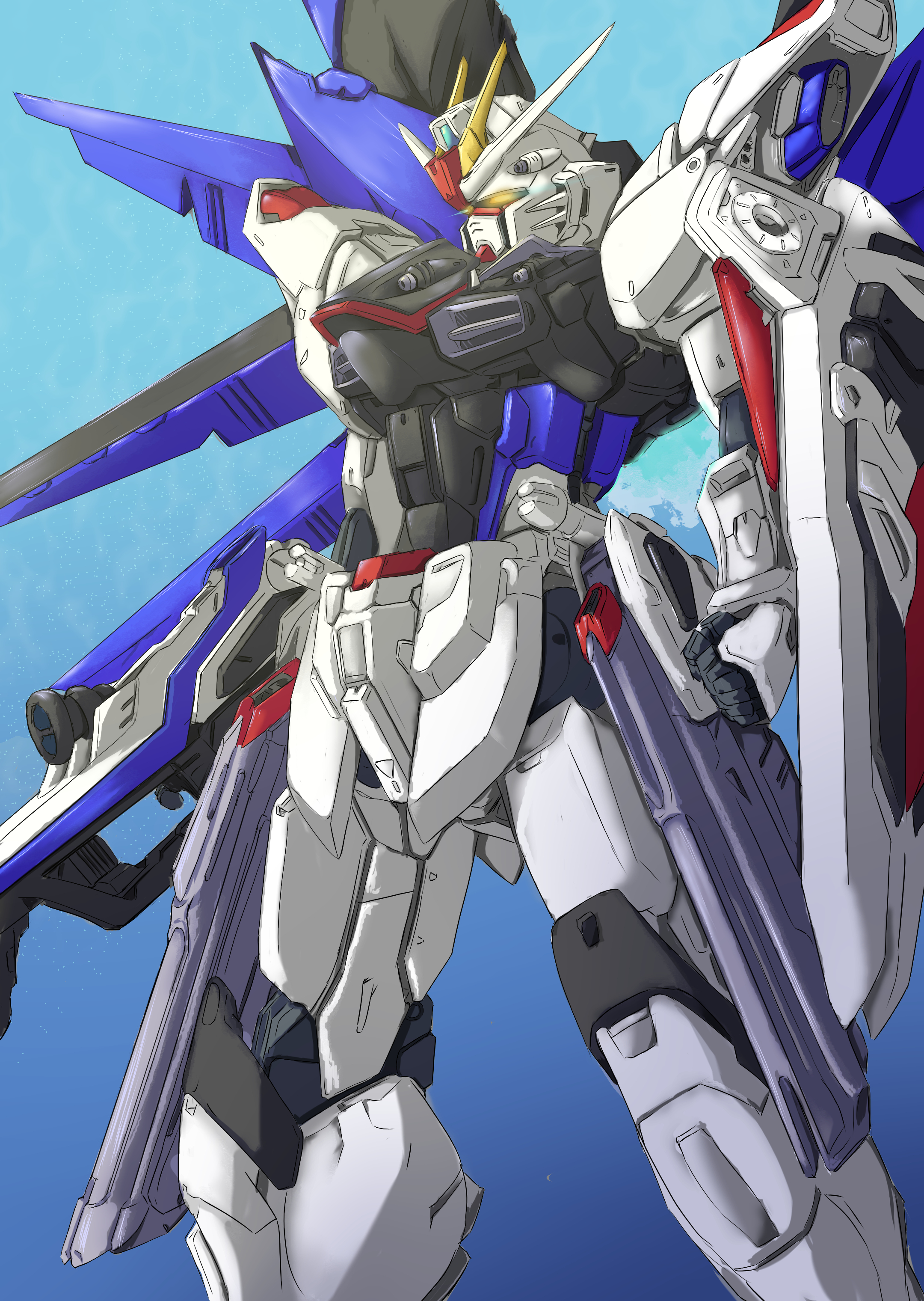 absurdres energy_sword clenched_hand datalyf freedom_gundam glowing glowing_eye gun gundam gundam_seed highres holding holding_gun holding_shield holding_weapon mecha mechanical_wings mobile_suit no_humans robot science_fiction shield solo v-fin weapon wings yellow_eyes