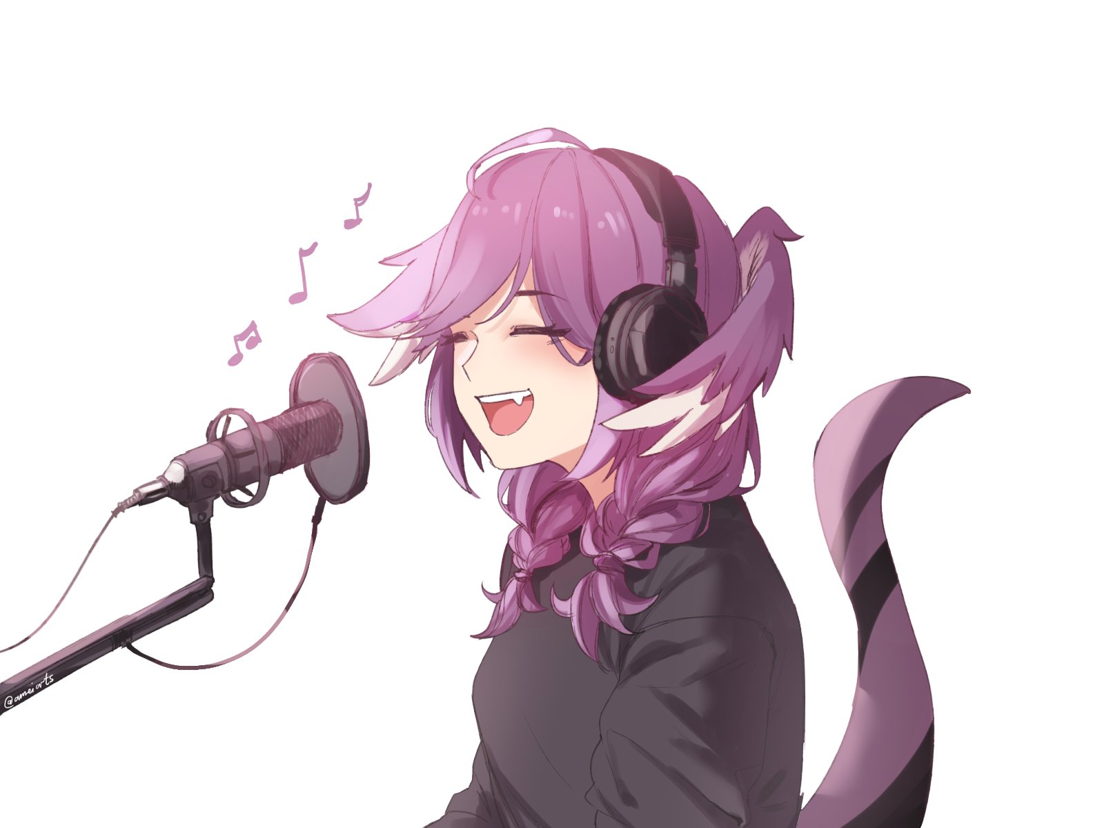 1girl ahoge ameiarts artist_name braid breasts closed_eyes commentary dragon_girl dragon_tail english_commentary fang head_wings headphones highres microphone music musical_note nijisanji nijisanji_en open_mouth purple_hair selen_tatsuki simple_background singing solo tail teeth tongue twin_braids twitter_username upper_body virtual_youtuber watermark white_background wings