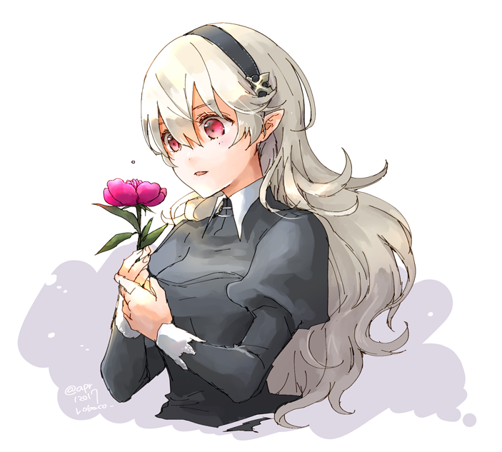 1girl black_hairband black_shirt blouse female_corrin_(fire_emblem) cropped_torso curly_hair fire_emblem fire_emblem_fates fire_emblem_if flower grey_hair hair_between_eyes hairband holding holding_flower intelligent_systems long_hair long_sleeves nintendo open_mouth pointy_ears red_eyes red_flower robaco shirt simple_background sketch solo twitter_username upper_body very_long_hair white_background