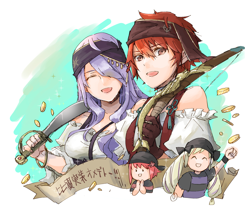 4girls :d ^_^ alternate_costume arm_up bandana black_bandana blouse bow_(weapon) brown_eyes camilla_(fire_emblem) camilla_(pirate)_(fire_emblem) closed_eyes coin collarbone elise_(fire_emblem) female_focus fire_emblem fire_emblem_fates gold_coin hair_between_eyes hair_over_one_eye headband hinoka_(fire_emblem) hinoka_(pirate)_(fire_emblem) holding holding_bow_(weapon) holding_sword holding_weapon long_hair multiple_girls nintendo off-shoulder_shirt off_shoulder official_alternate_costume open_mouth pirate_costume purple_hair red_hair robaco saber_(weapon) sakura_(fire_emblem) shirt short_hair short_sleeves siblings sisters sketch smile sword very_long_hair weapon white_shirt
