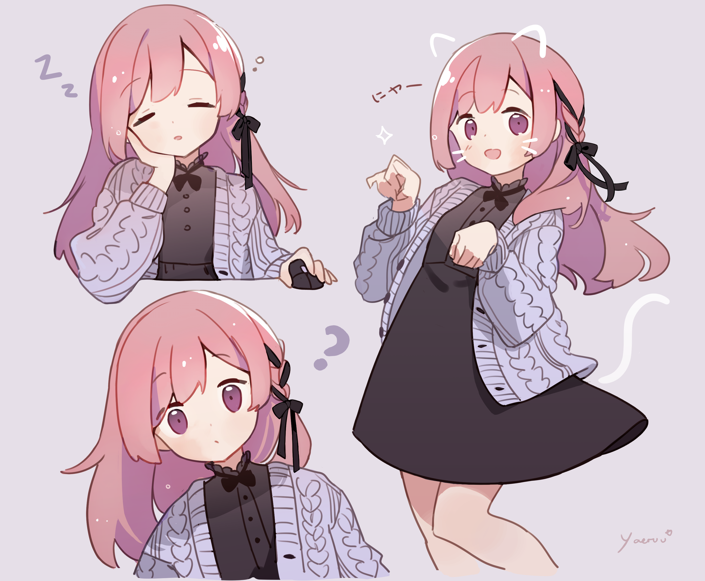 1girl ? absurdres animal_ears black_ribbon black_skirt braid cat_ears cat_tail collar computer_mouse cowboy_shot cropped_legs frilled_collar frills hand_on_own_face highres indie_utaite indie_virtual_youtuber long_hair mikeneko_(vtuber) mikeneko_(old_design)_(vtuber) paw_pose pink_hair purple_background purple_eyes ribbon simple_background skirt sleeping sleeping_upright sleeveless sparkle sweater tail yae_ruu zzz