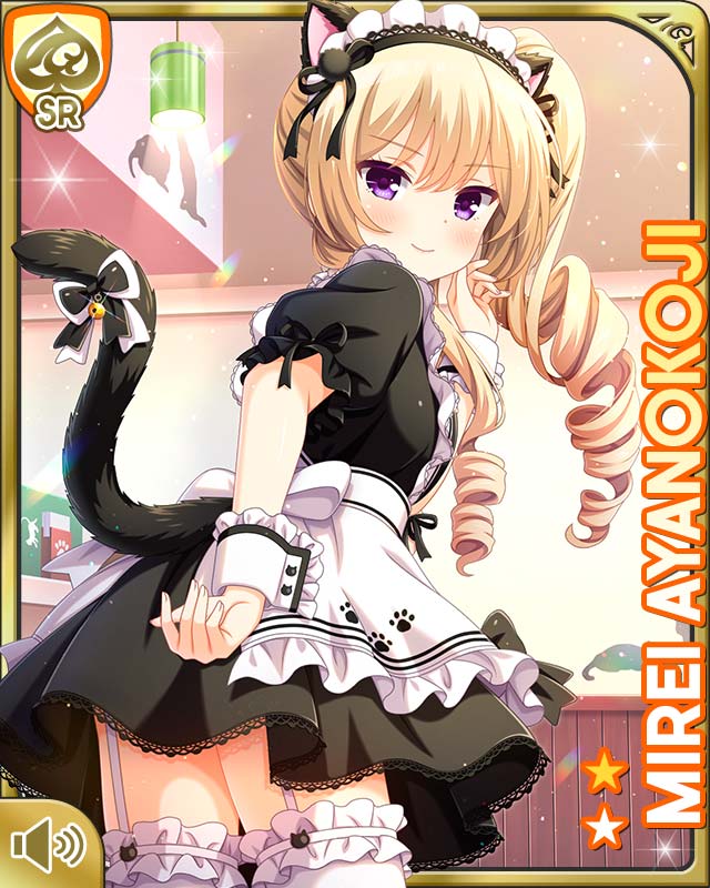 1girl animal_ears apron ayanokoji_mirei black_dress black_neckwear blonde_hair bow cafe card cat_ears cat_tail character_name closed_mouth curly_hair day dress drill_hair fake_animal_ears fake_tail girlfriend_(kari) green_bow hair_bow indoors long_hair maid_headdress official_art ouju paw_print purple_eyes qp:flapper ringlets smile solo standing tagme tail thighhighs very_long_hair white_apron white_headwear white_thighhighs